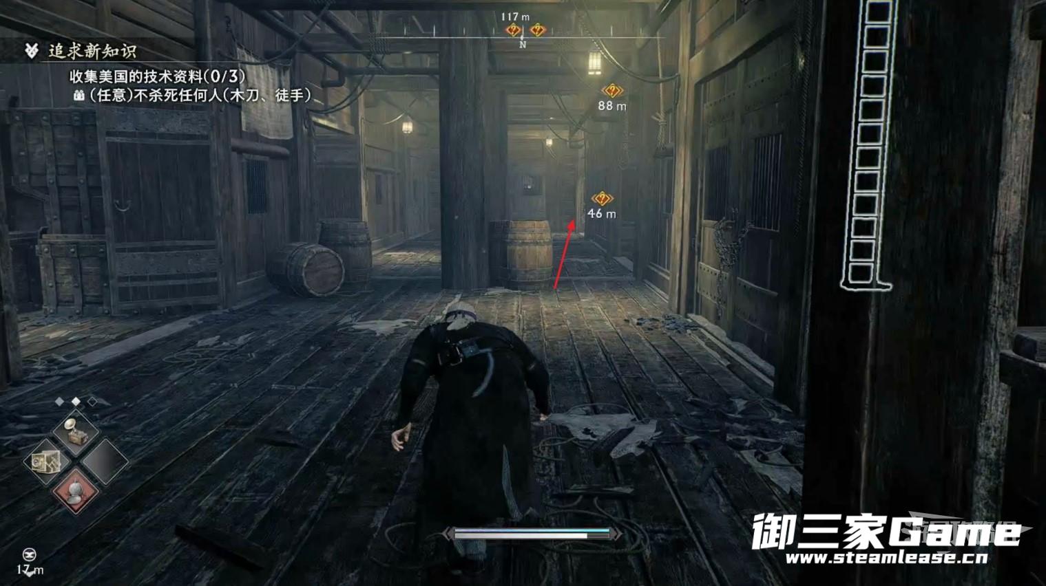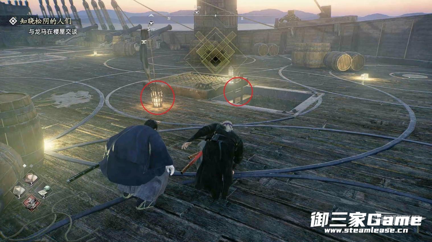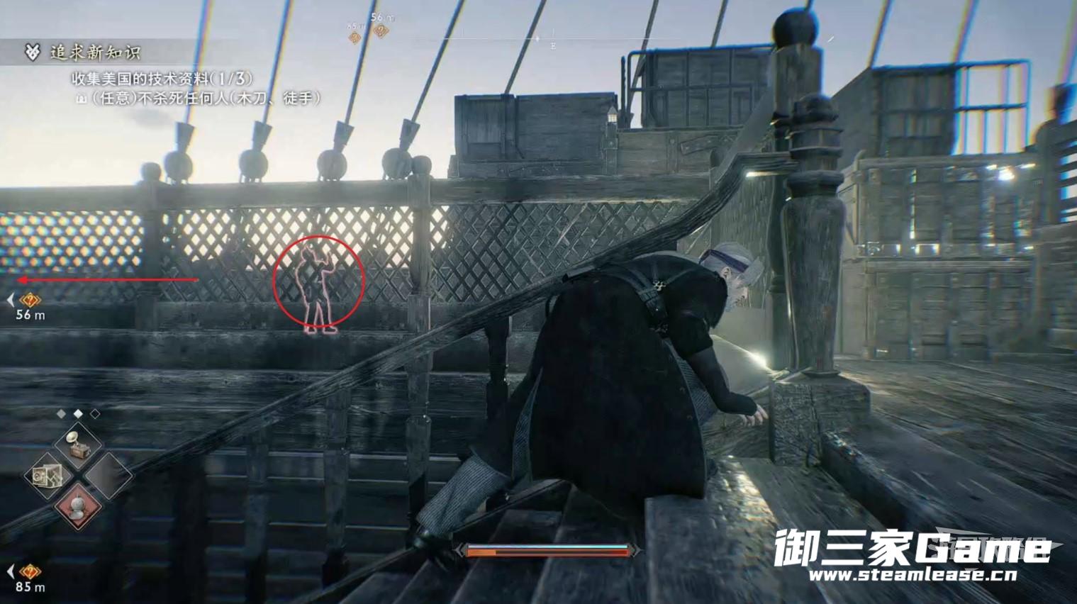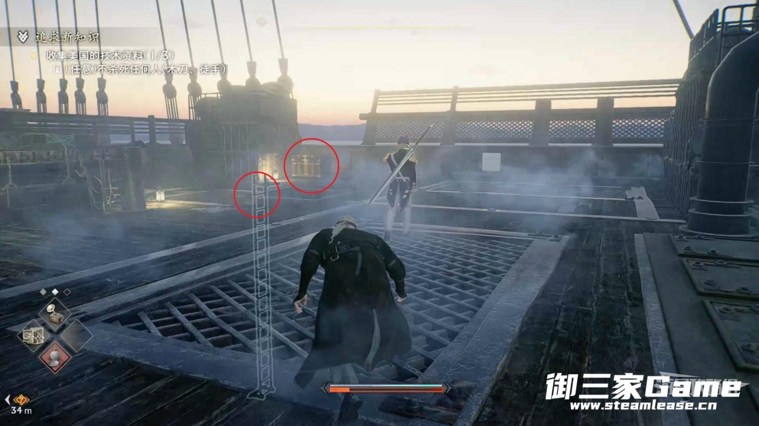 来到甲板先往左看,暗杀掉左侧的看海士兵并往左走。