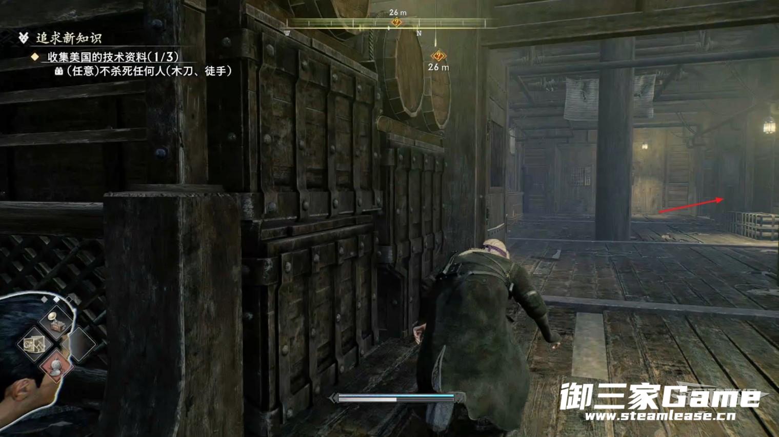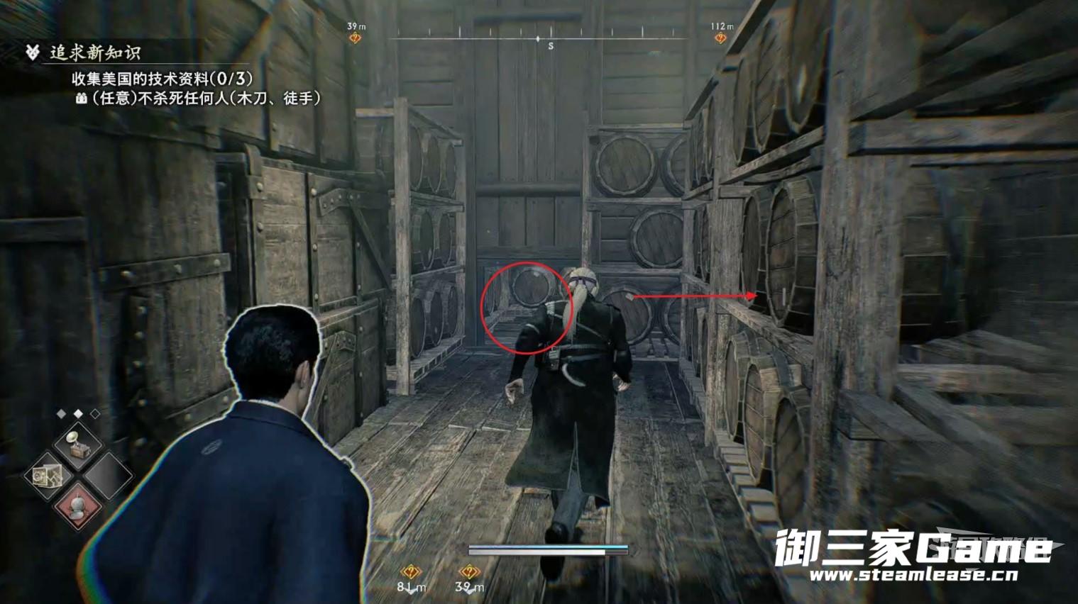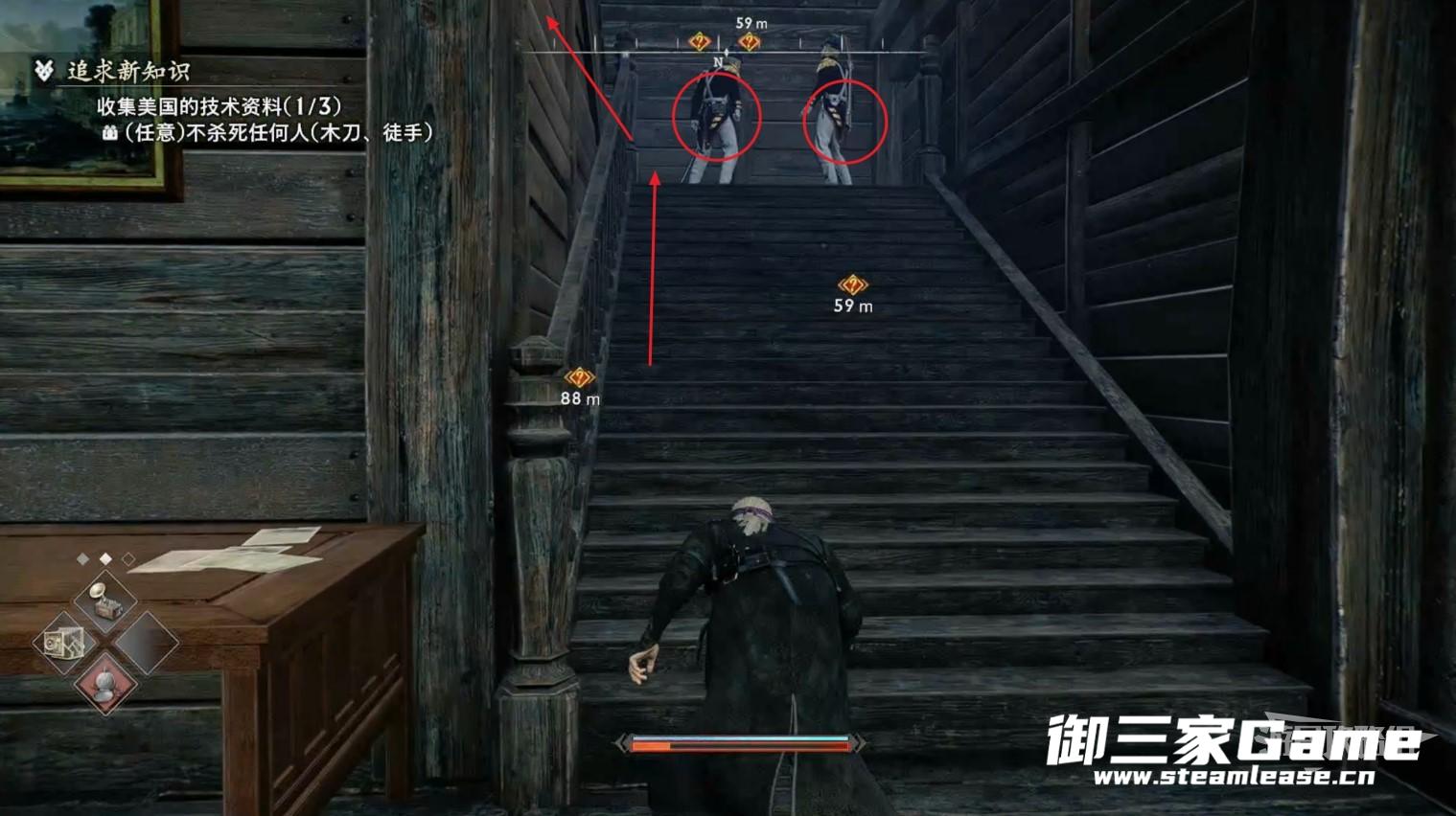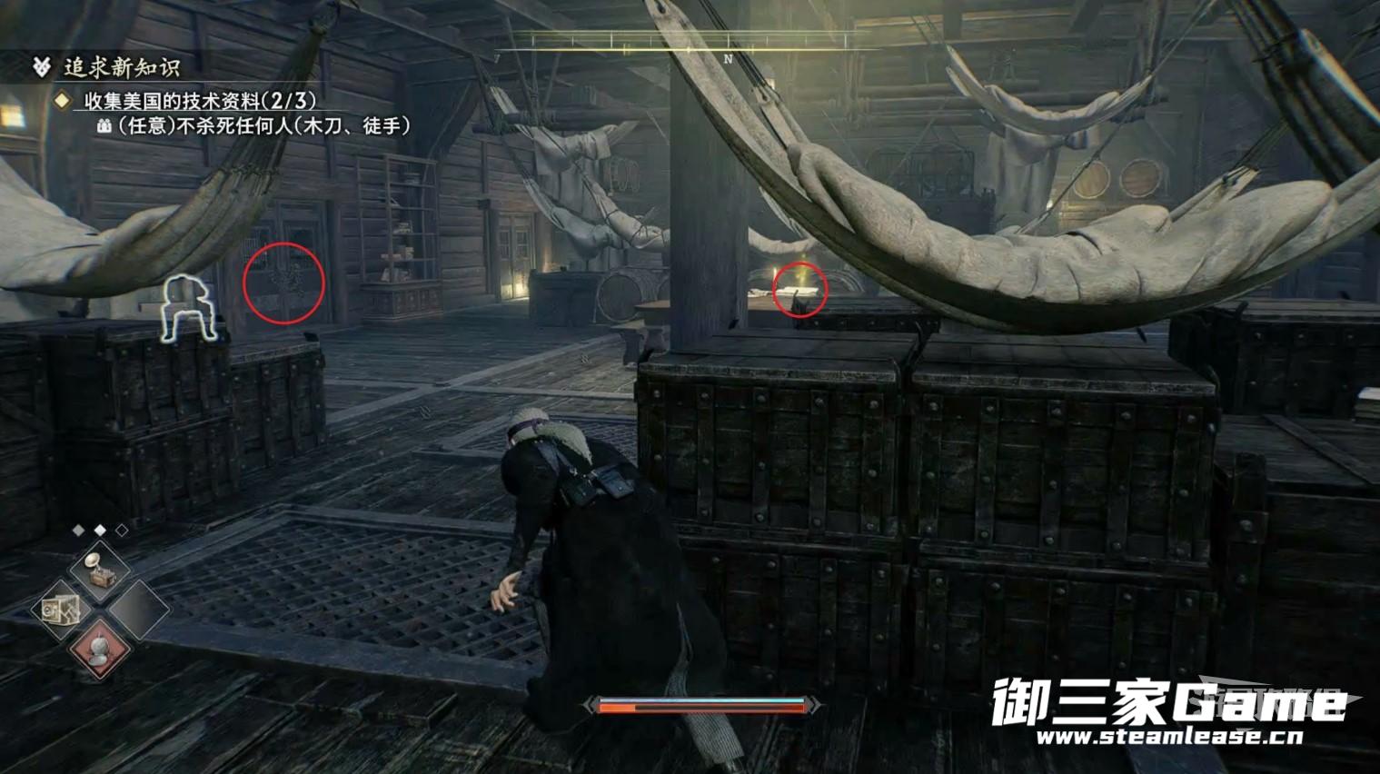 这里有一个箱子可以开启,接着回到楼梯口往右走到尽头。路上有两个巡逻的士兵,可以等待时机暗杀也可以正面硬上,看自己的选择。