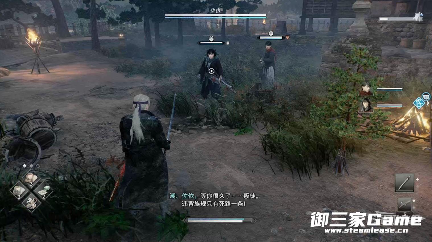 发现这里有几个黑洲藩余党在此处等候我们。黑洲藩是我们曾经隐刀时期效力的地方,而脱藩者是死罪,所以会有黑洲藩的人来攻击我们。
