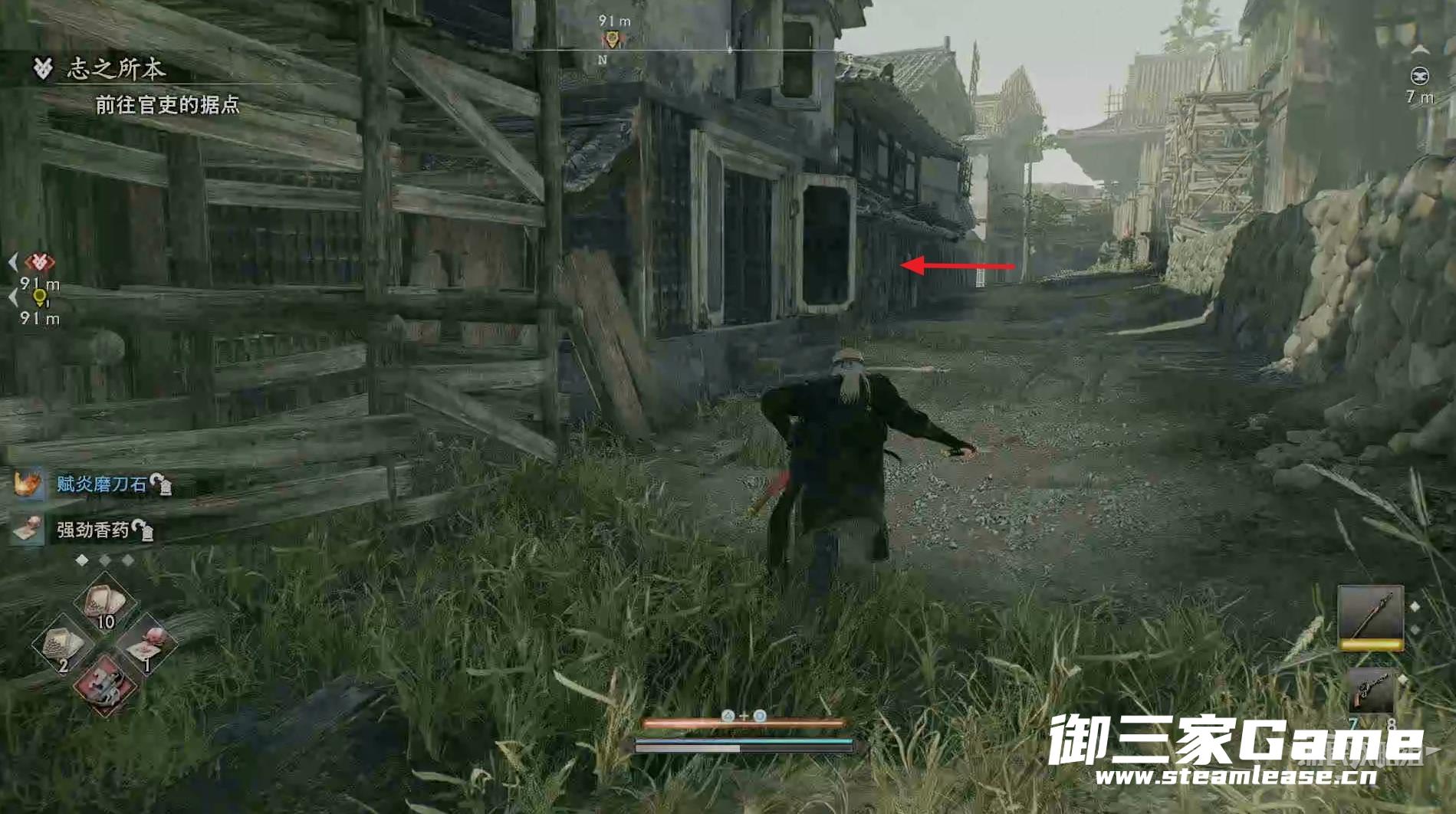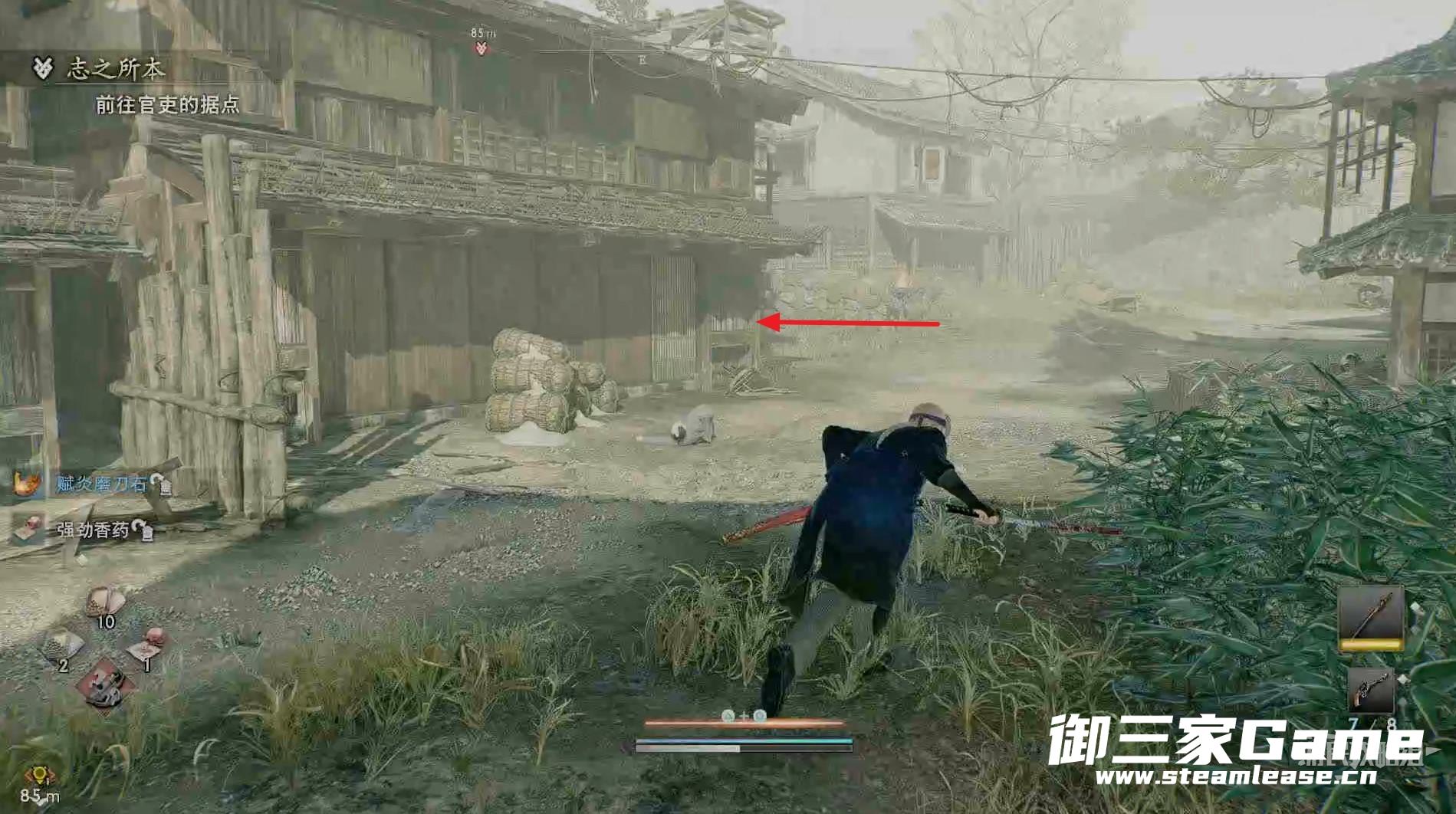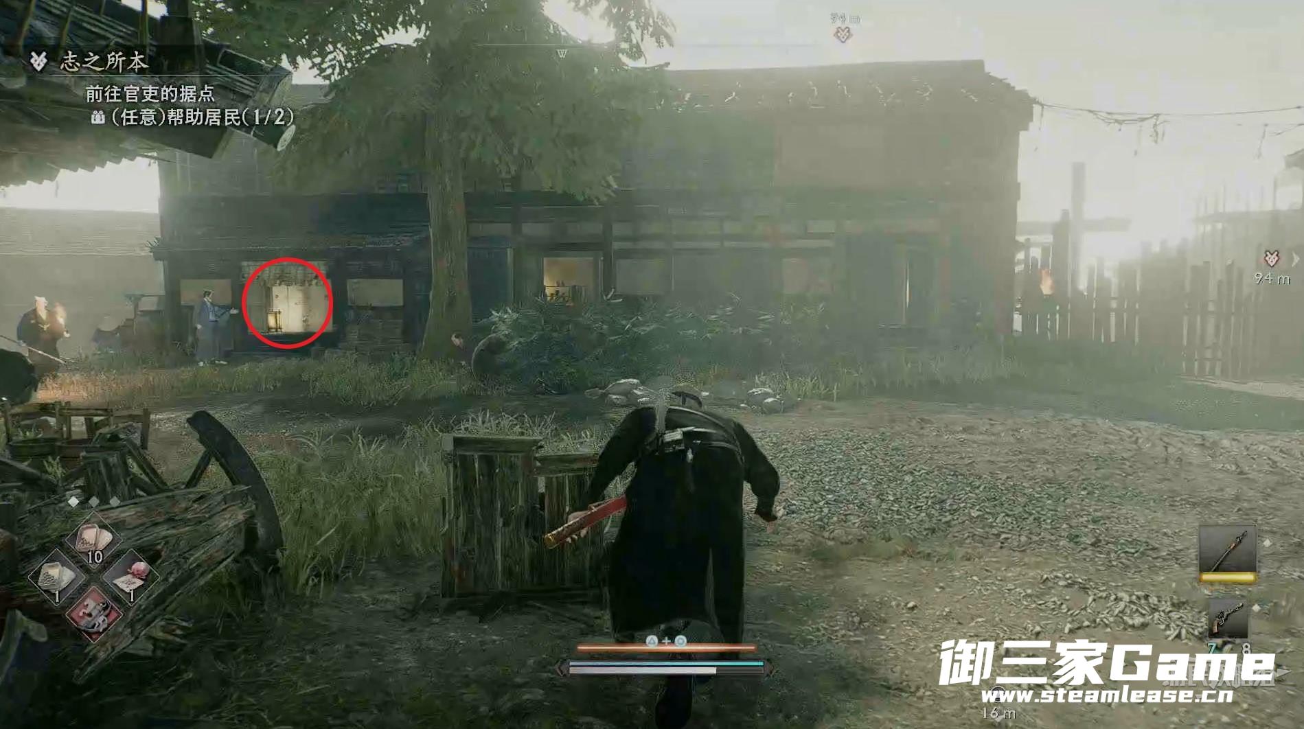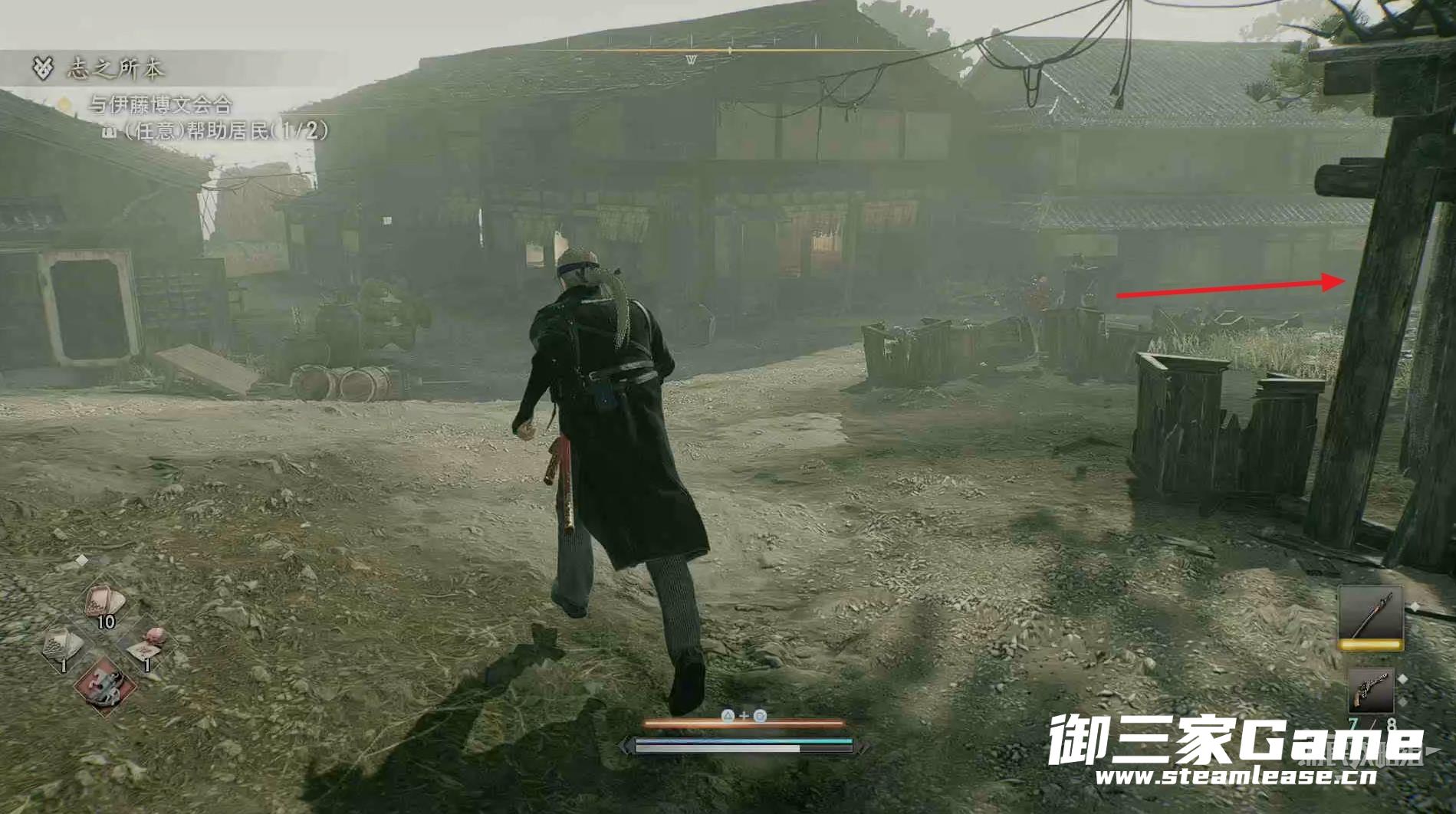 左拐后走到尽头发现来到一个岔路,先往右走,干掉右侧的敌人并进入右边的房子。