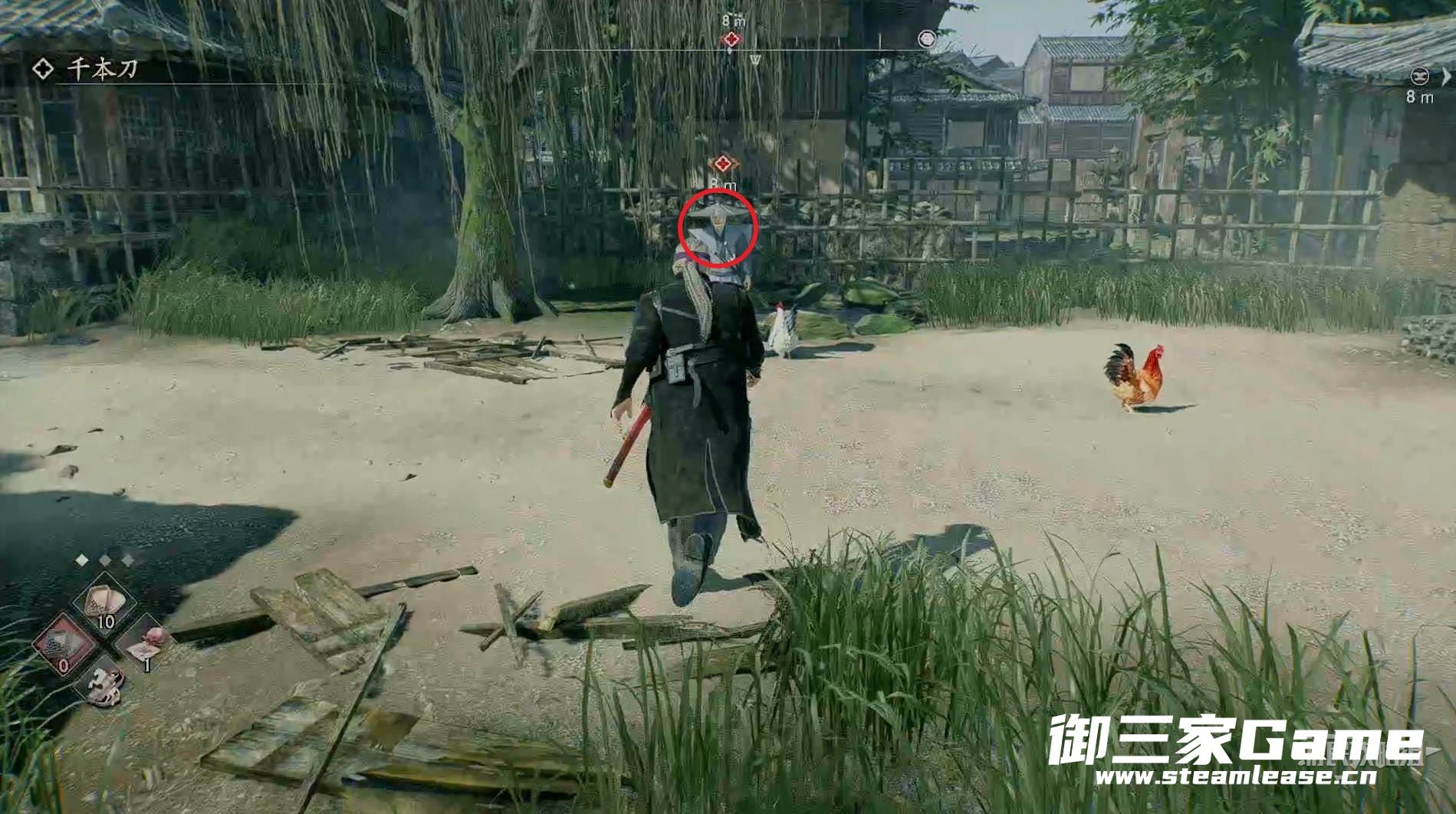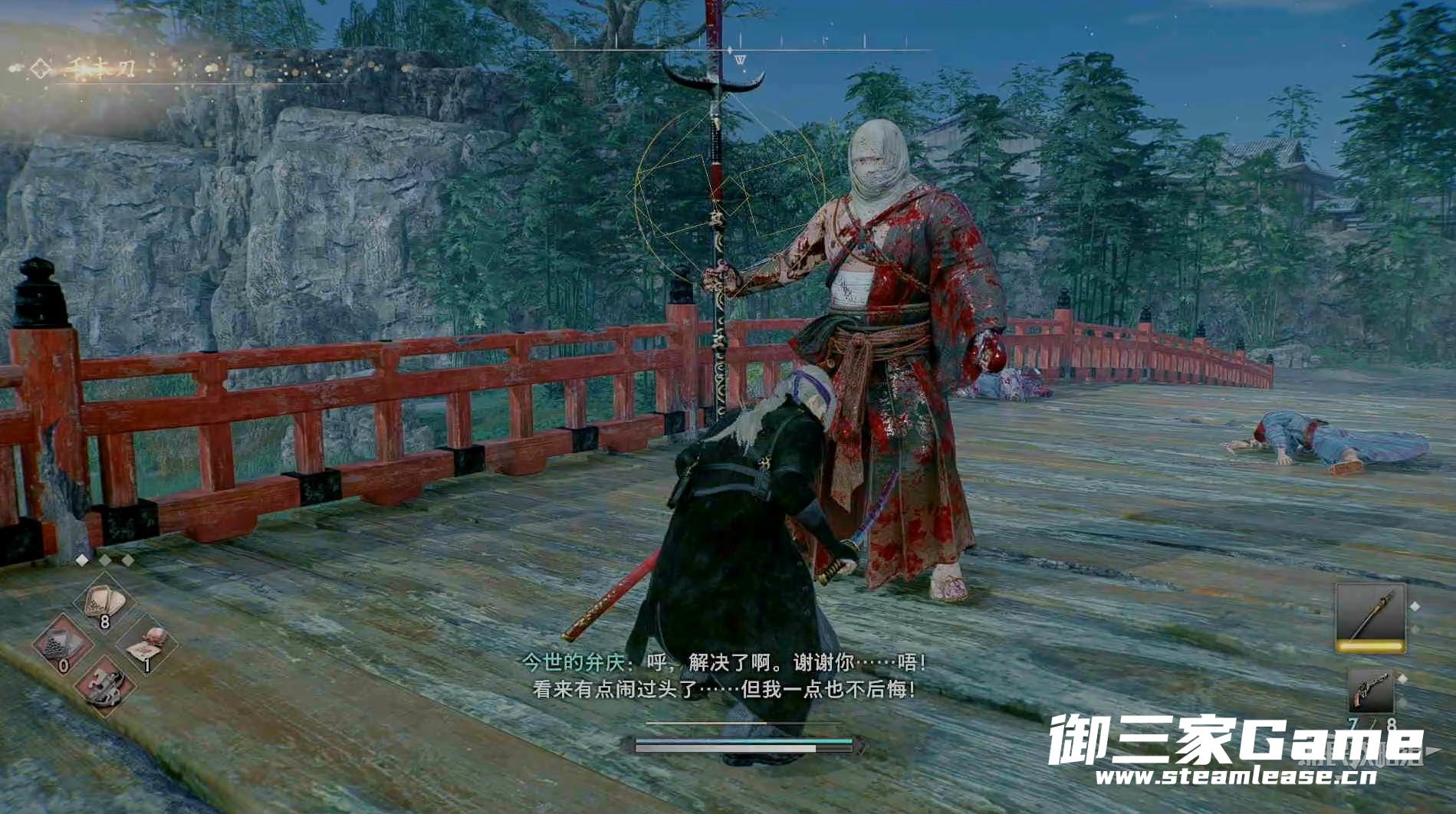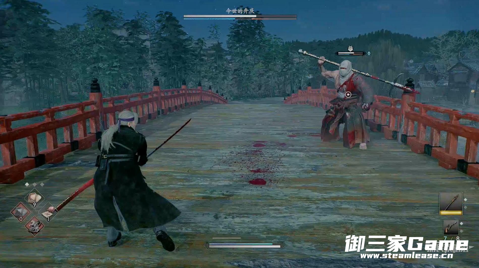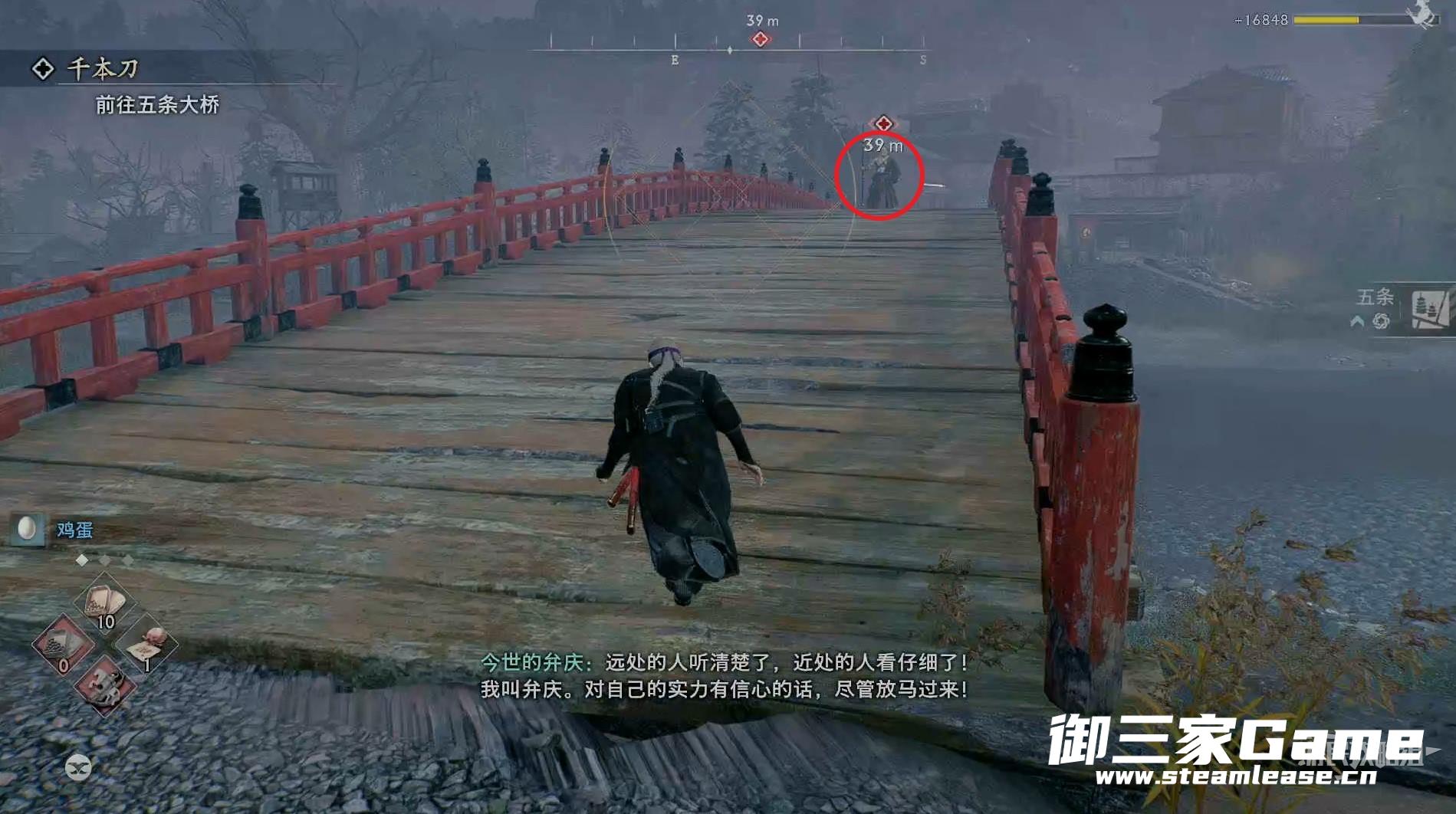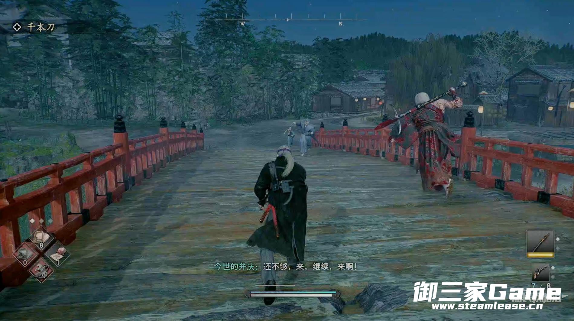 来到此处与戴帽子的武士对话得知附近有一个喜欢在桥上与别人单挑的疯子,每次单挑都会抢走别人的武器。