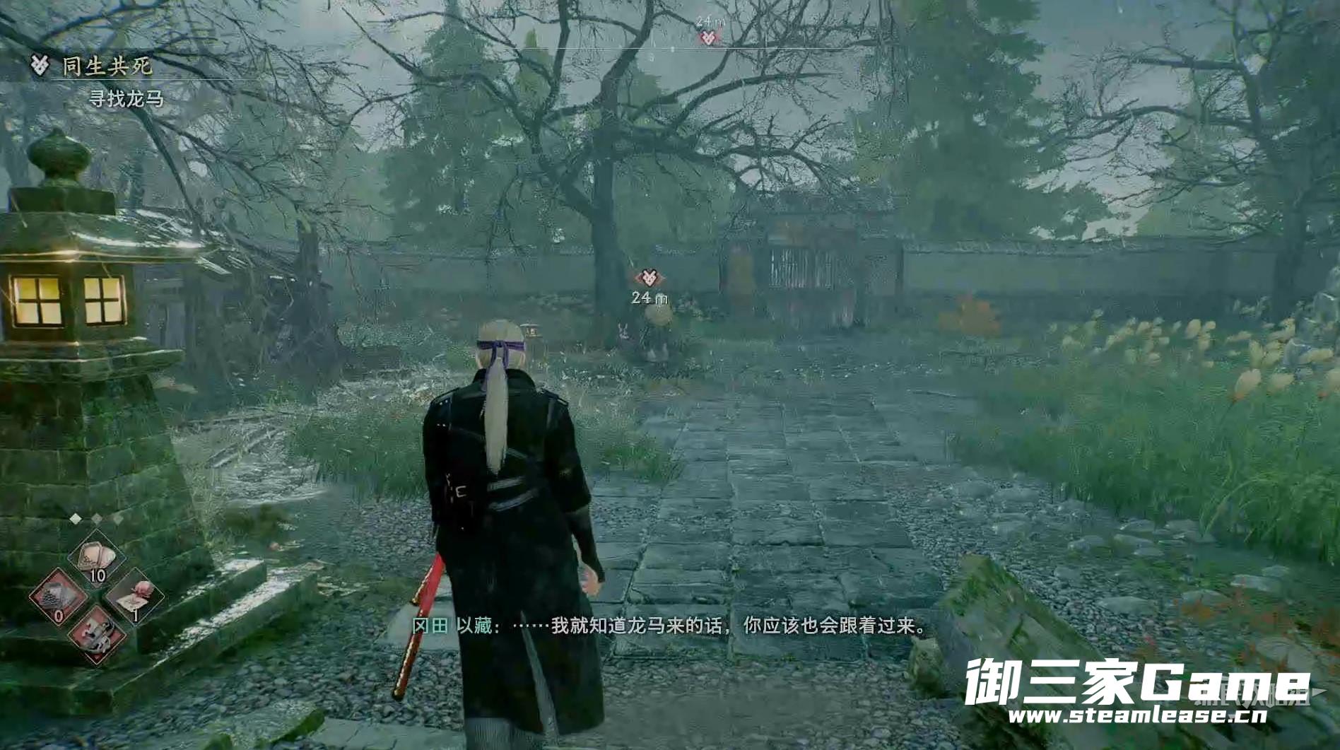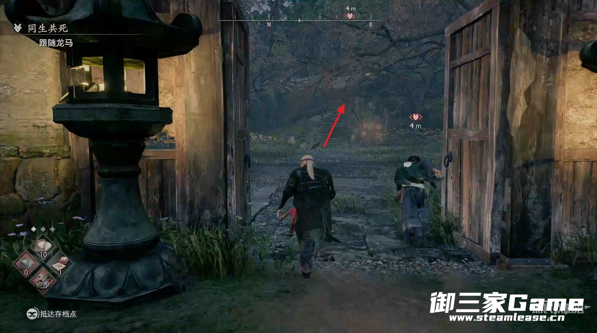 跟着龙马来到目标寺庙,直接沿着楼梯进入最里面的房子里。