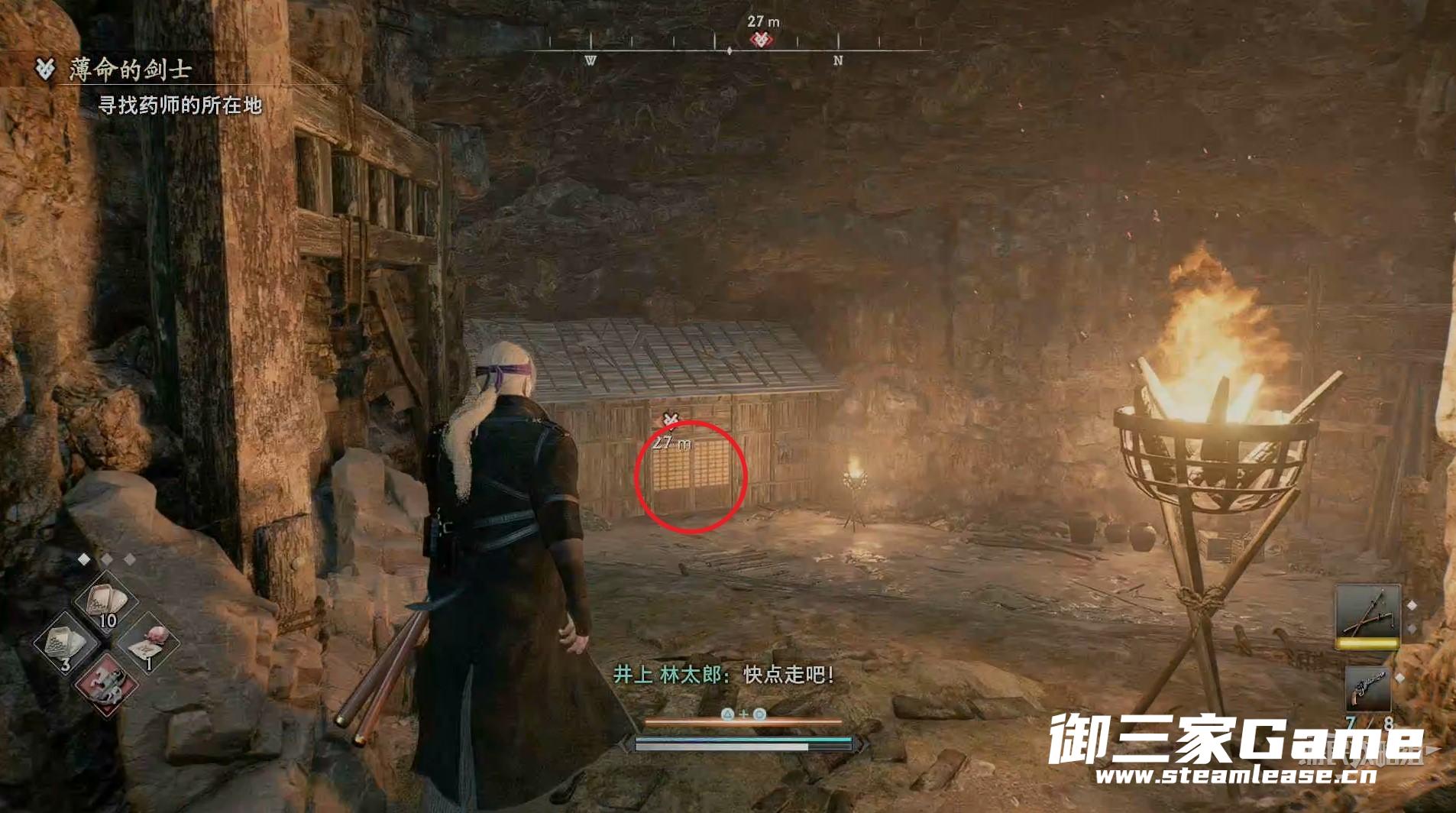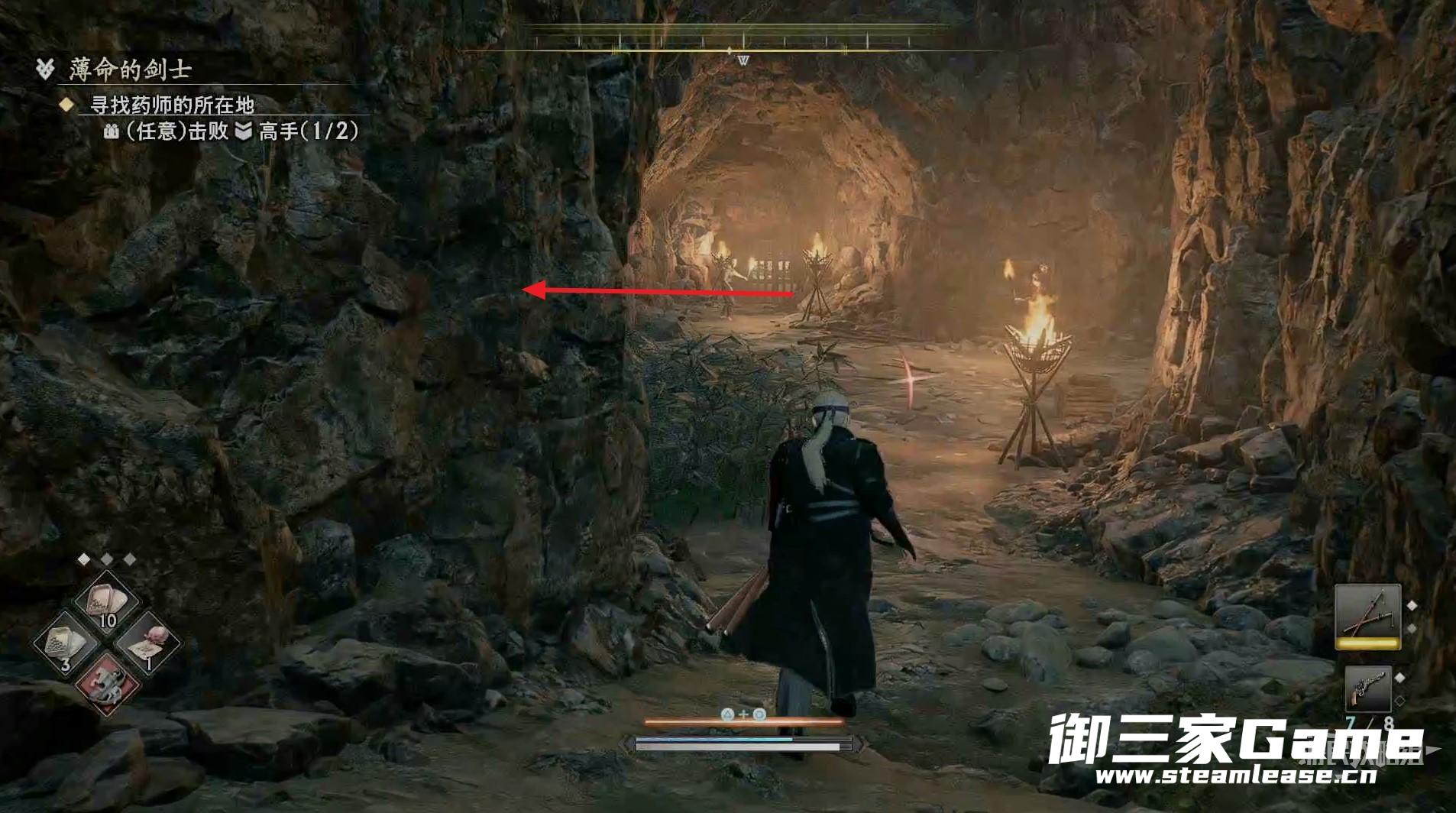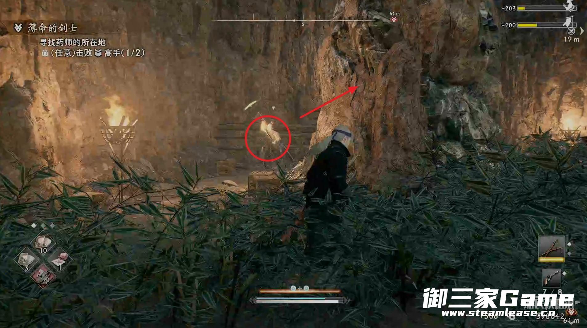 来到目的地先往右侧房子走,击败里面的第一个高手,接着沿着楼梯进入左侧的洞穴。