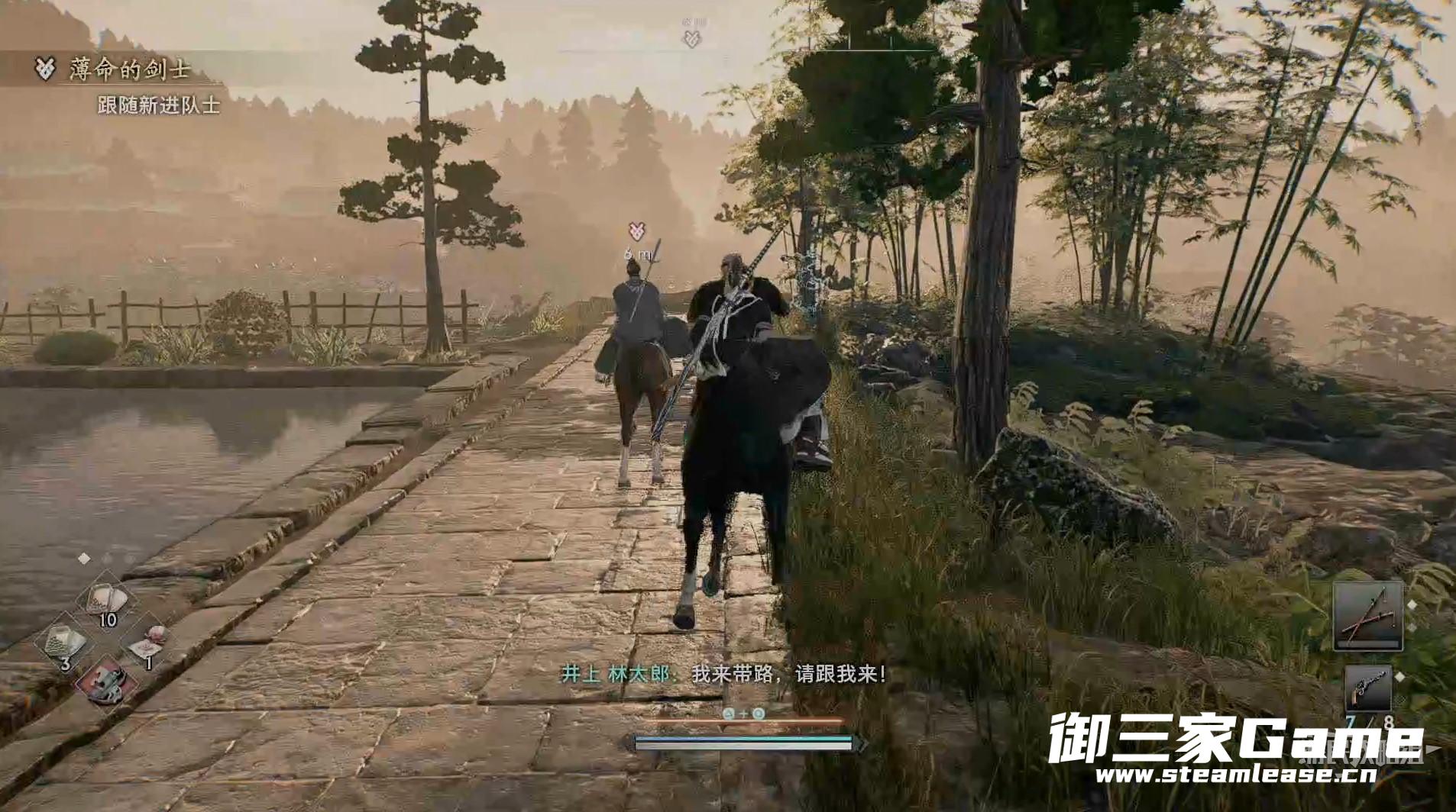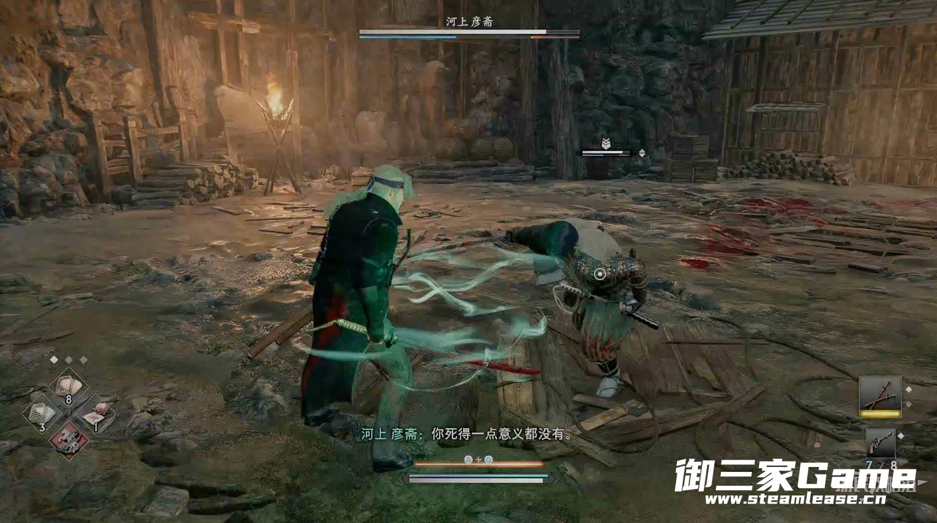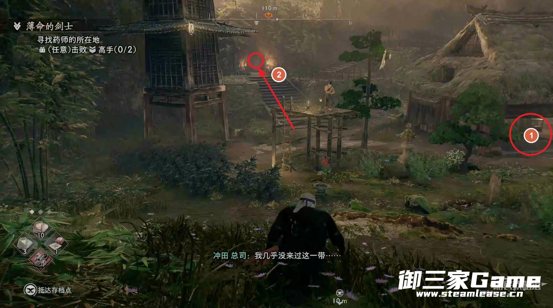 来到目的地先往右侧房子走,击败里面的第一个高手,接着沿着楼梯进入左侧的洞穴。