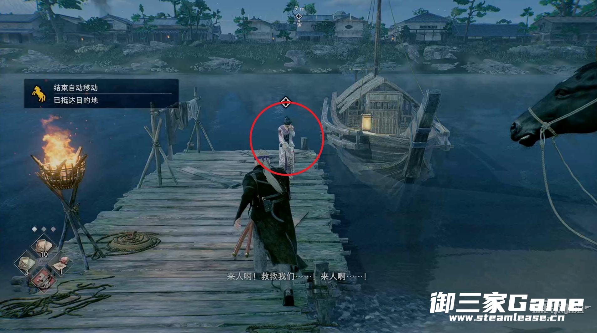 与河边的女子对话得知一群恶棍绑走了他的主人,所以希望我们能帮助他。