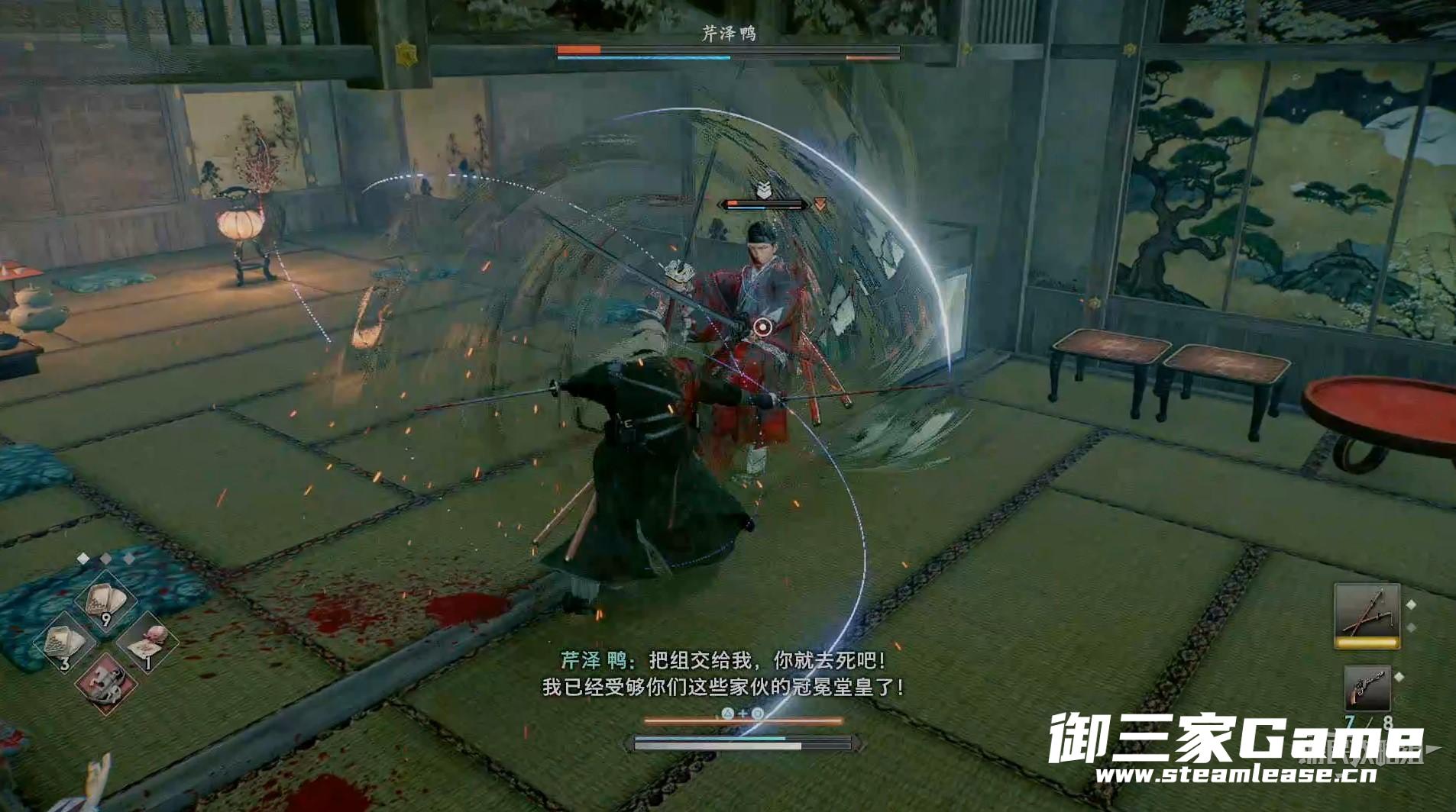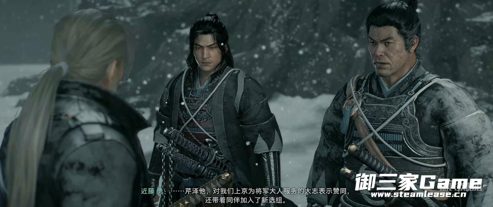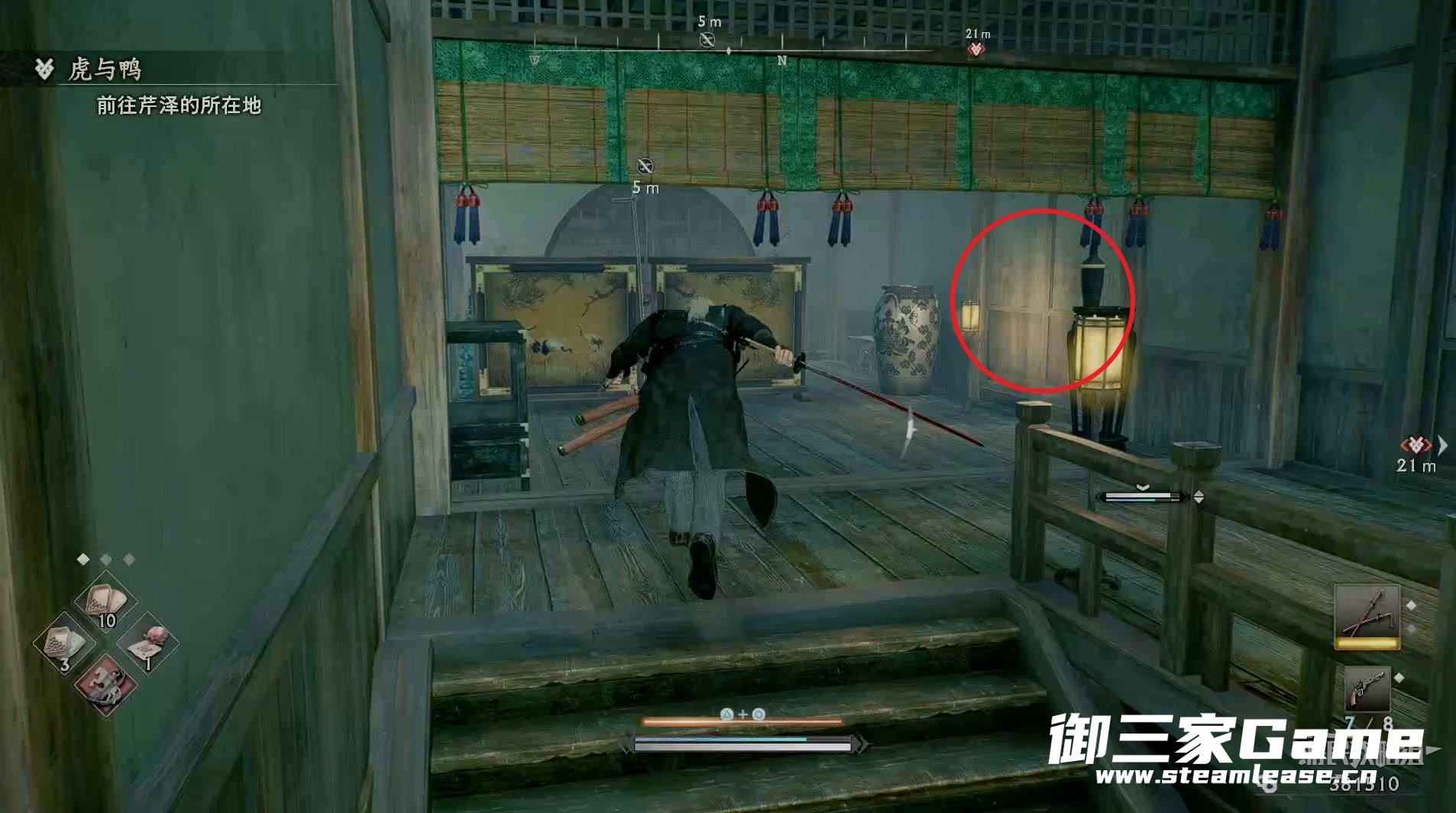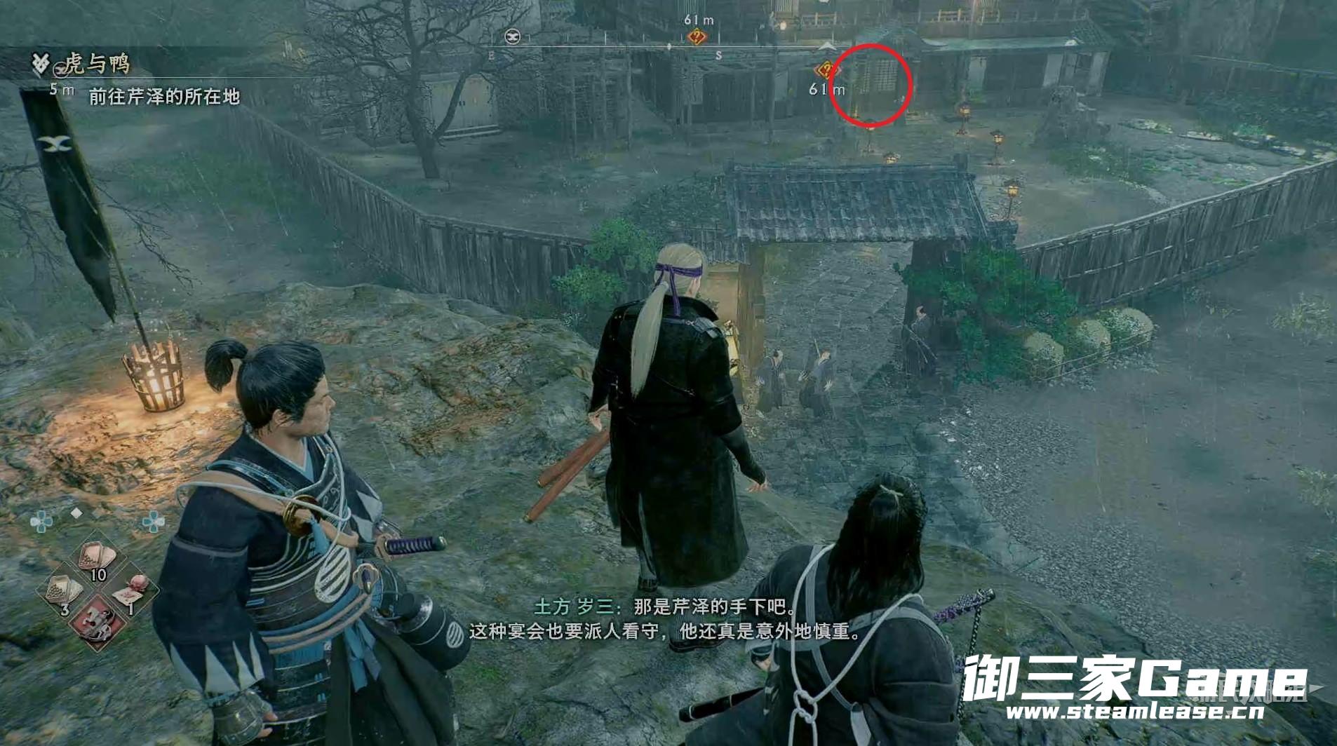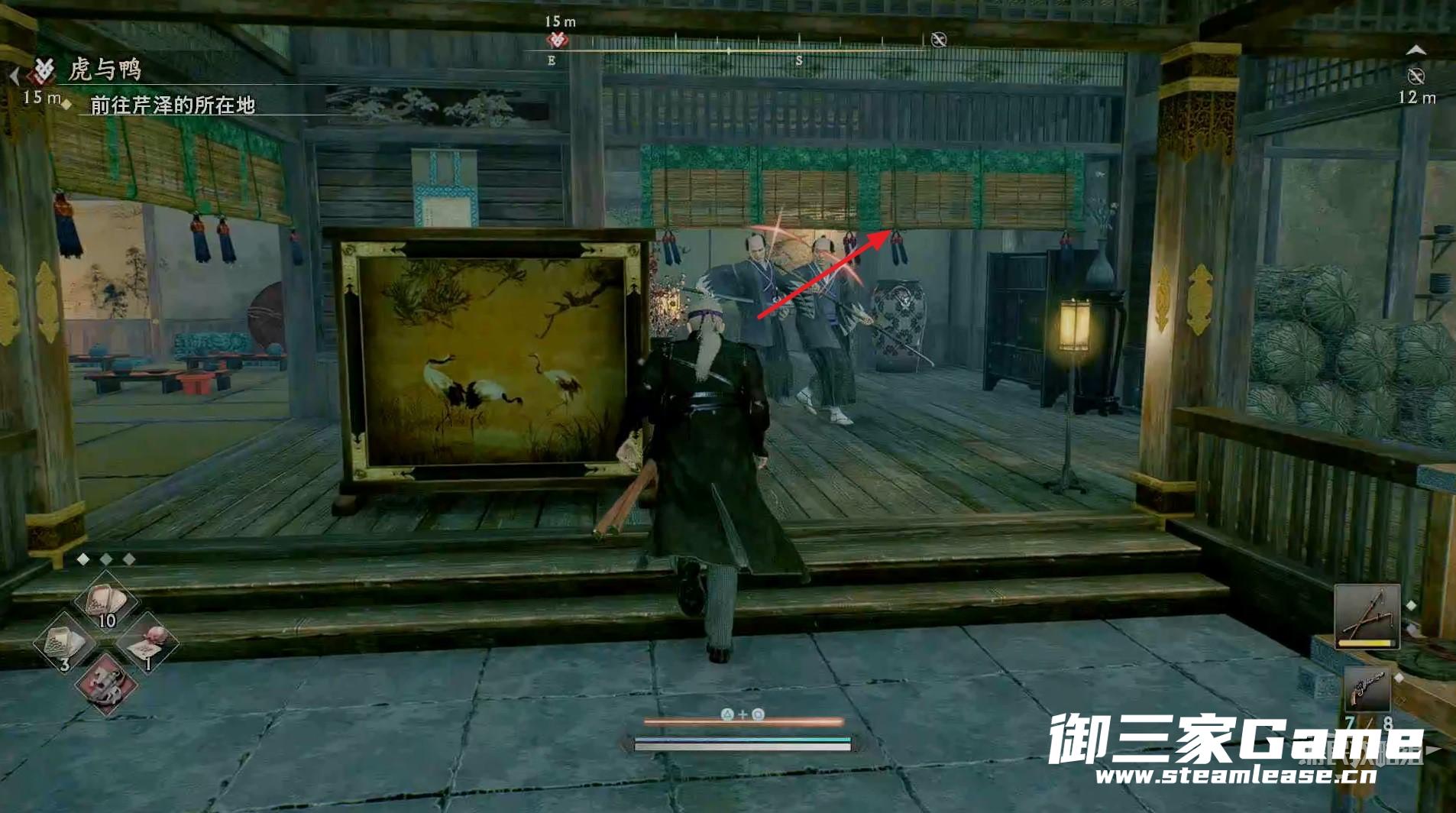 跟着近藤勇来到目标建筑门口,不用管院子里的敌人,直接跑到正门进入建筑。