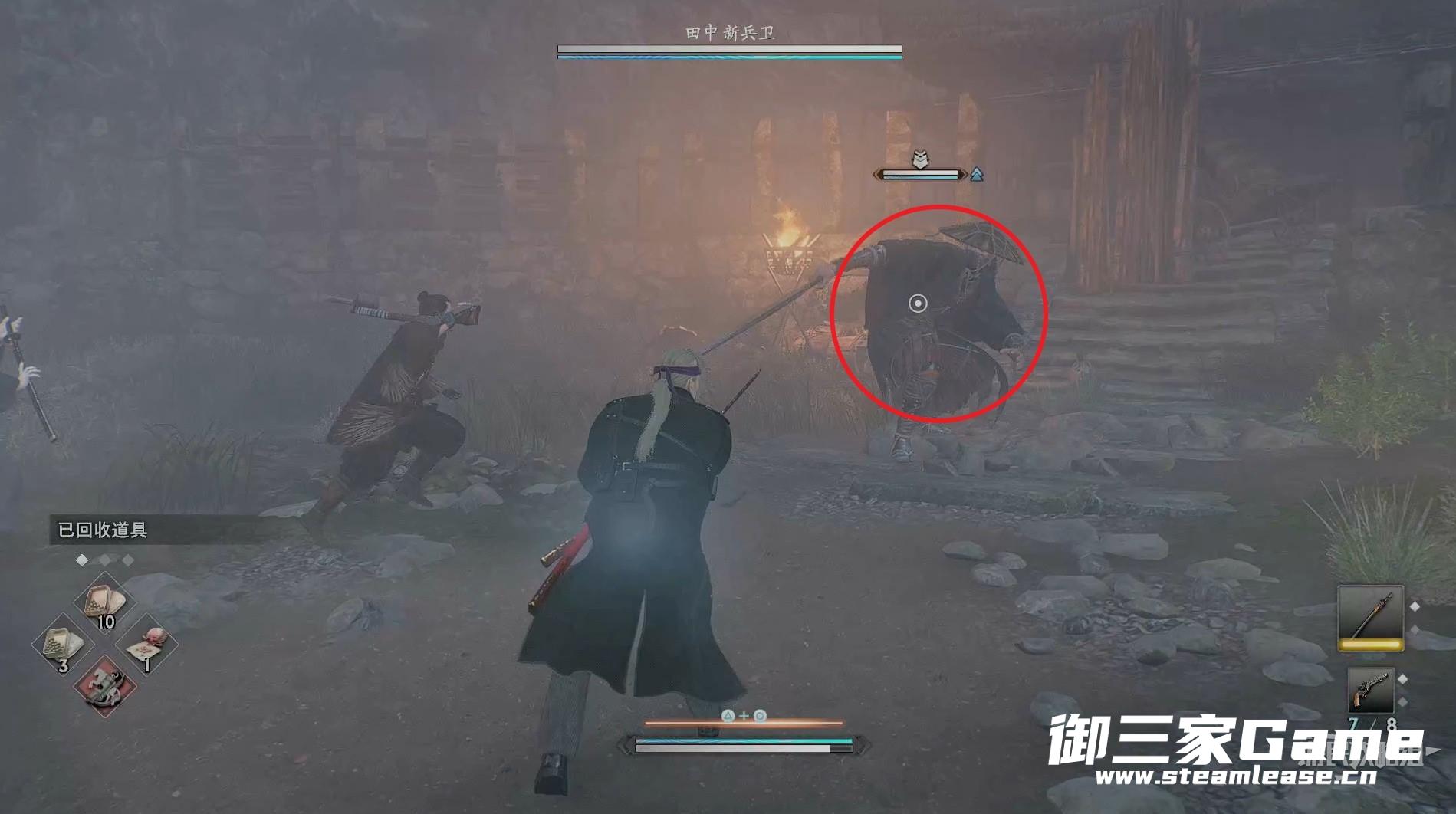来到山中小屋的门前发现BOSS就在这里等着我们,注意他很喜欢使用腿踢我们,使用石火弹反的手感不是很好,需要把握节奏。