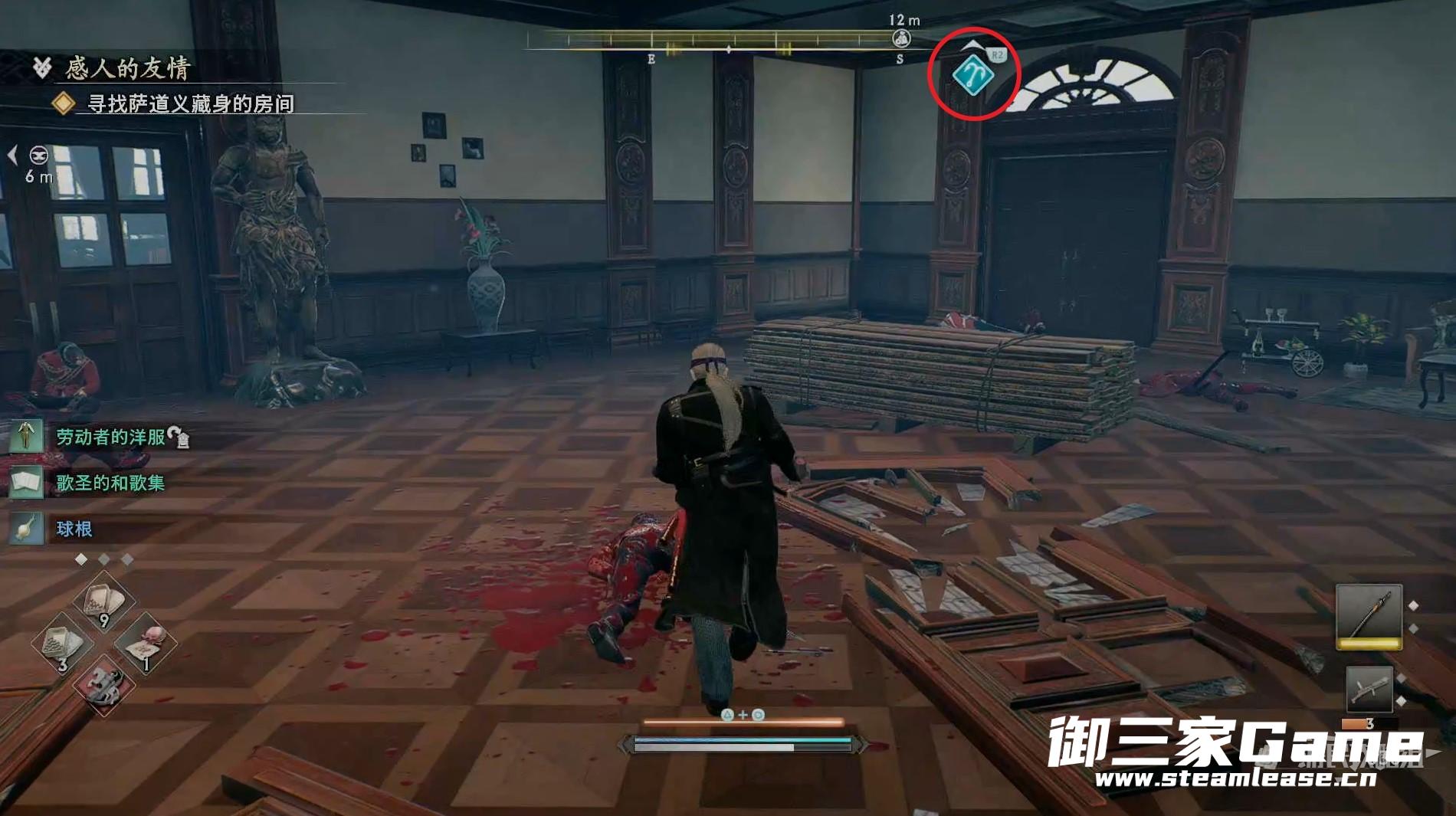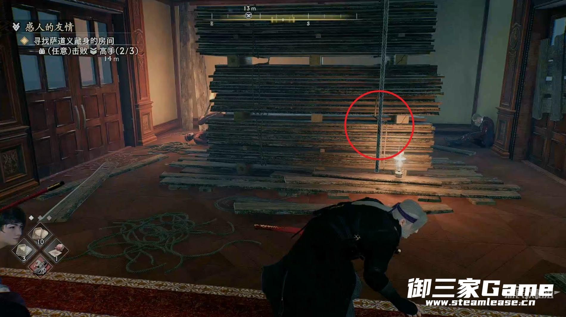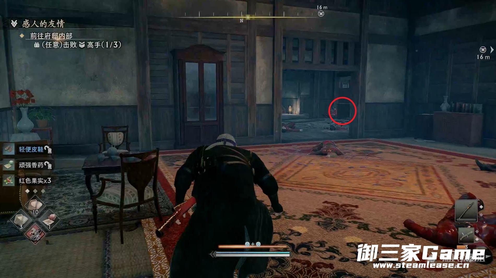 先走到敌人后面将其暗杀掉,注意敌人的身后有一个陷阱。