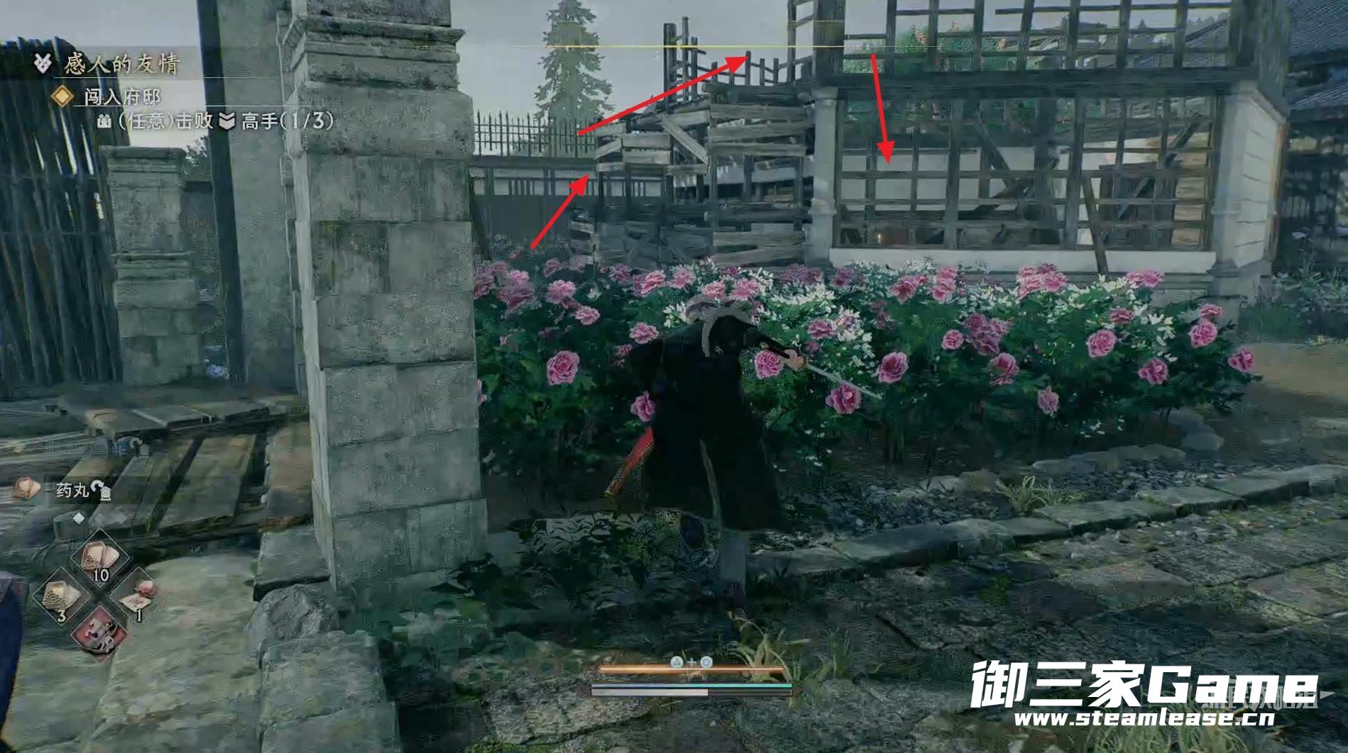 将全部敌人击败往右看,通过右侧的钩爪点跳到上层。