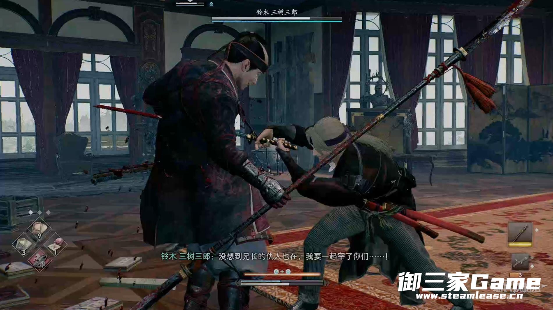 两个BOSS铃木三树三郎与田中新兵卫都是之前打过的敌人,取得战斗胜利与NPC交谈完成任务。
