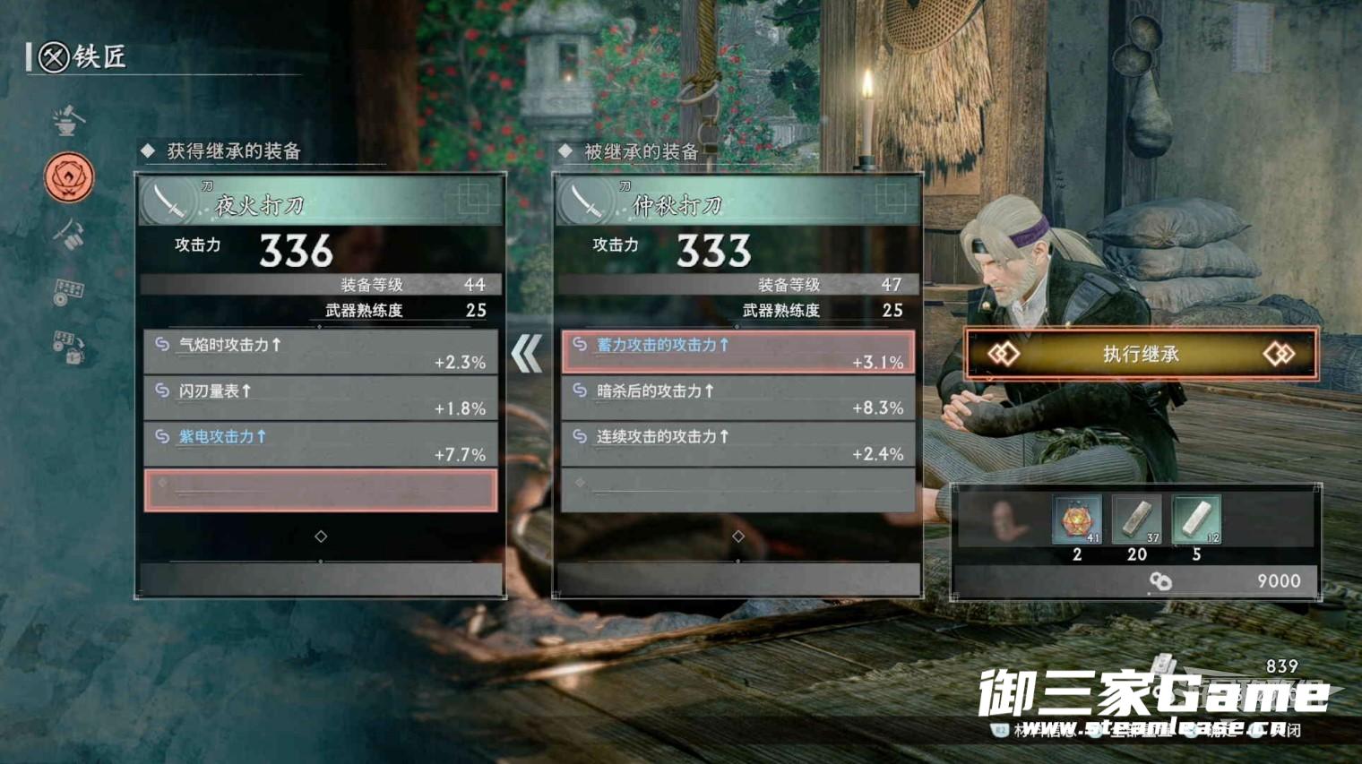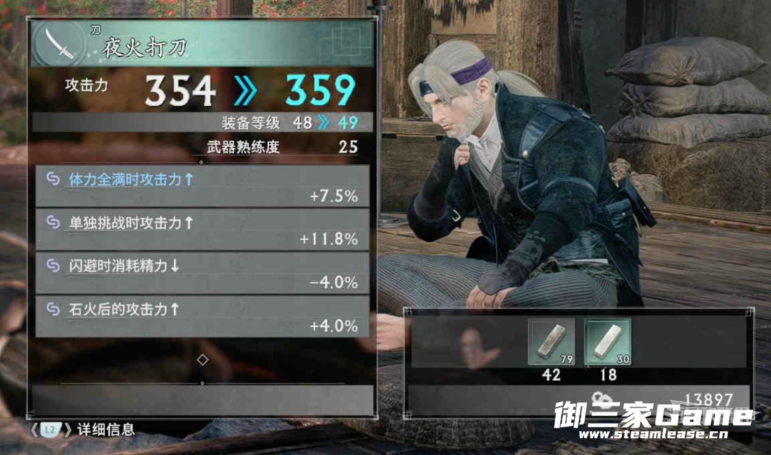 在铁匠铺或长屋可以强化自己的装备并消耗一定数量的材料,这里需要注意的是装备强化并不会提升特殊效果,所以刷出一把特殊效果较高的武器便很重要。