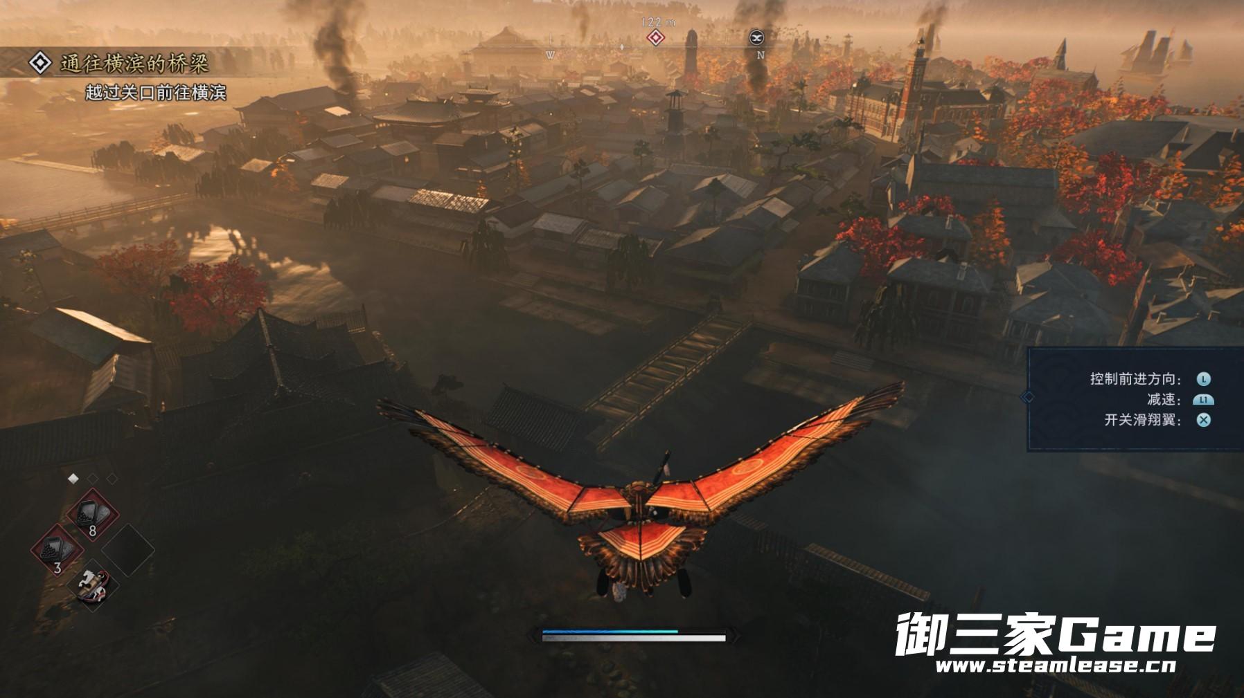 爽快体现在由勾爪登高和滑翔伞飞行构成的空中通路,加上拥有“自动导航”系统的策马奔腾,配合游戏中十分密集的传送点,让我移动起来可以感受到充足的自由度——并非没有其他游戏采用这样的滑翔伞飞行系统,比如育碧的《芬尼斯:渡神纪》,但问题大概在于:这些拥有滑翔伞的游戏,“上坡”到达高处并不容易,包括《芬尼斯:渡神纪》模仿的老祖宗《塞尔达:荒野之息》,但是《浪人崛起》,因为勾爪系统的存在,绝大部分的高处都是可以想上就上,加上很多传送点,它就是在塔顶或者悬崖方面玩家到处乱飞。