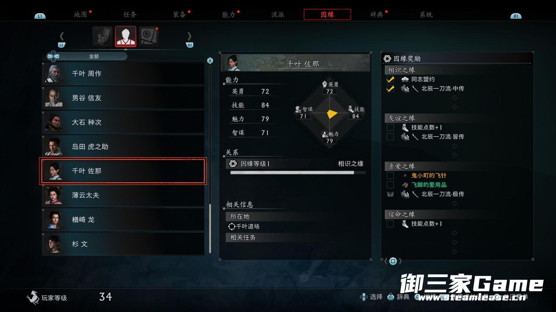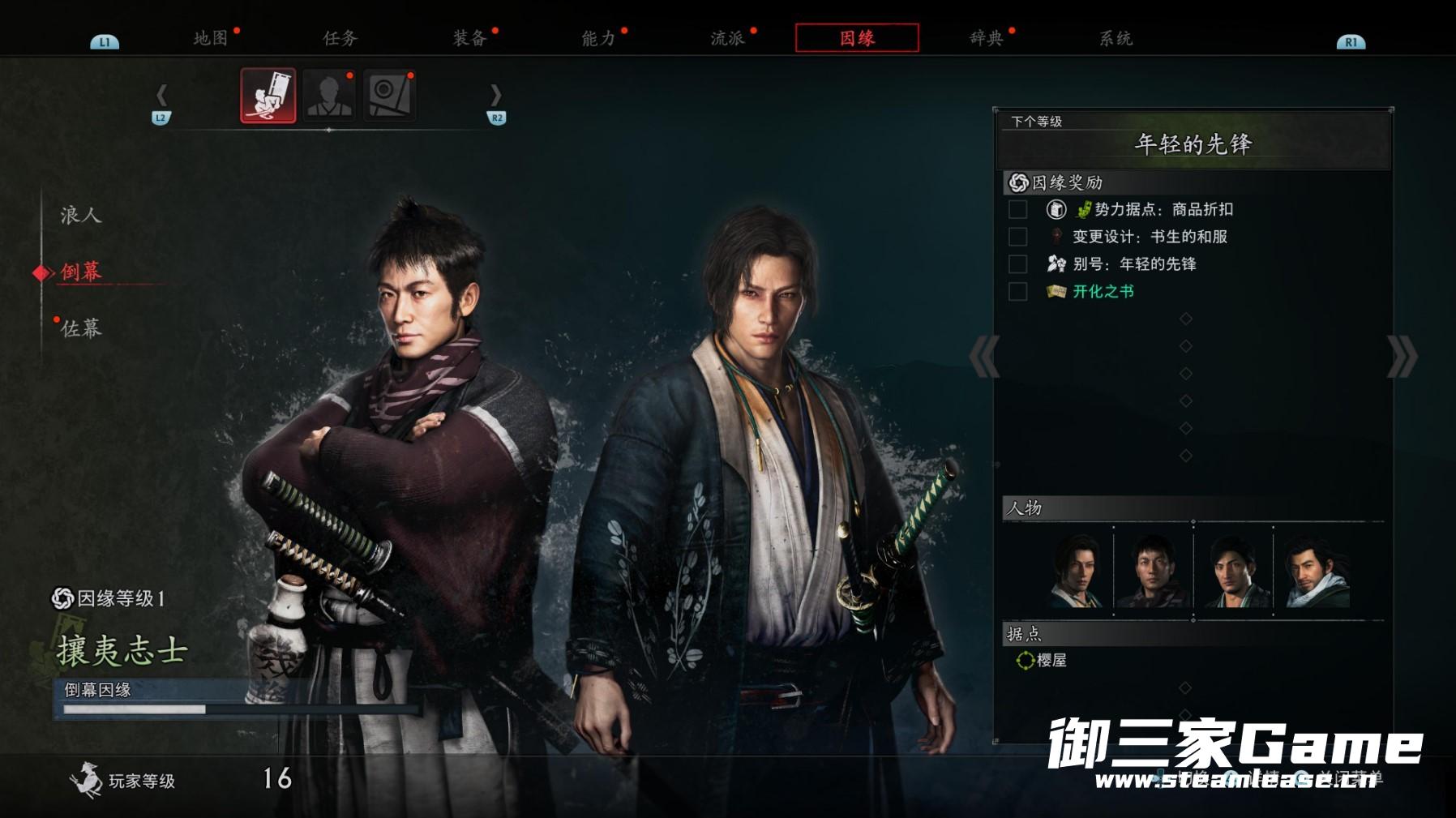 然后游戏最为亮眼的任务系统是角色任务,这一套内容又可称“幕府异闻录”——我们一共可以和几十位幕末期间各派的人士建立关系,和土地的“因缘等级”类似,还有角色和派系(倒幕、佐幕和浪人)的因缘等级,这些等级提升也可以带来类似于属性技能点这样的独特好处。