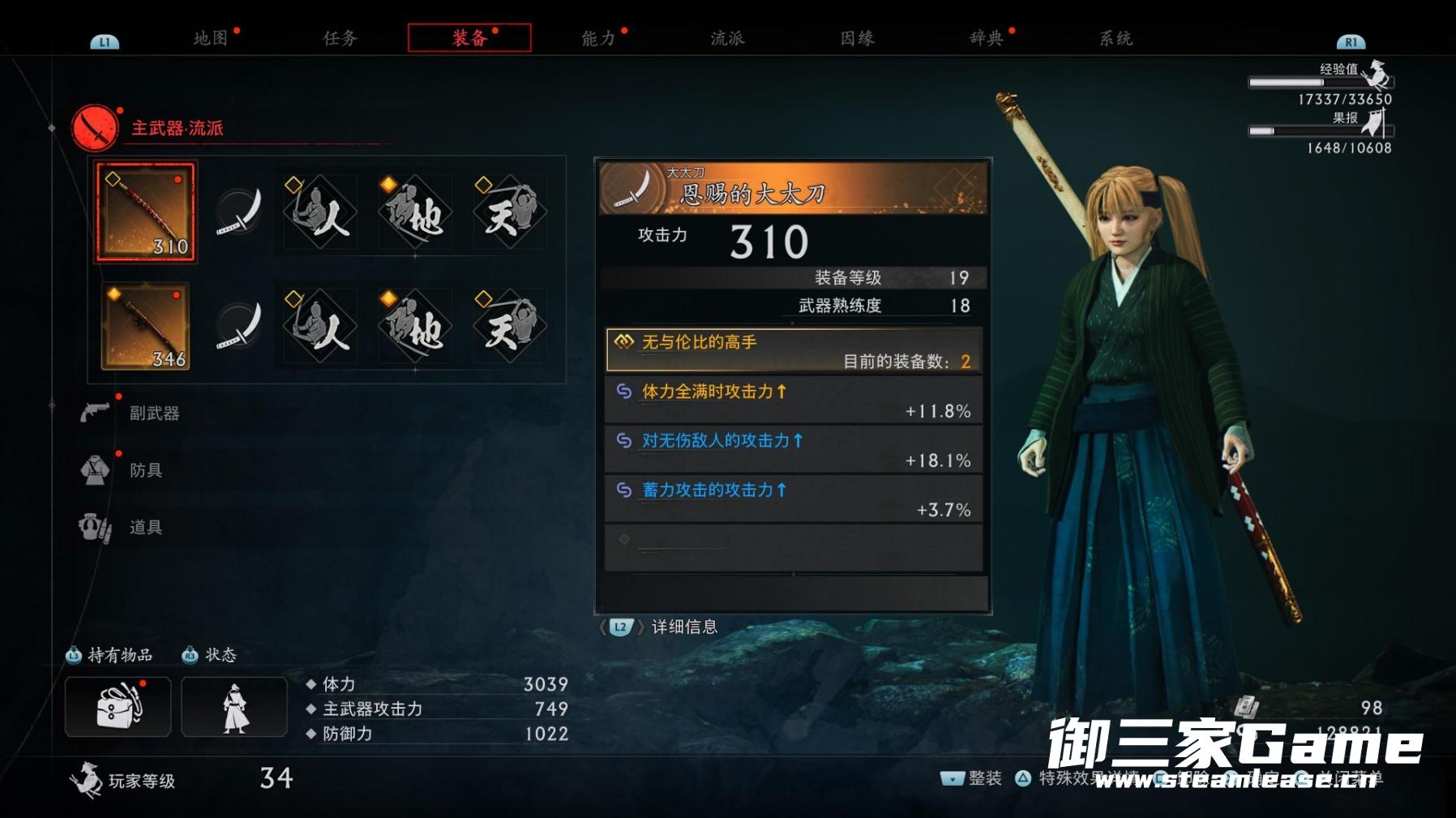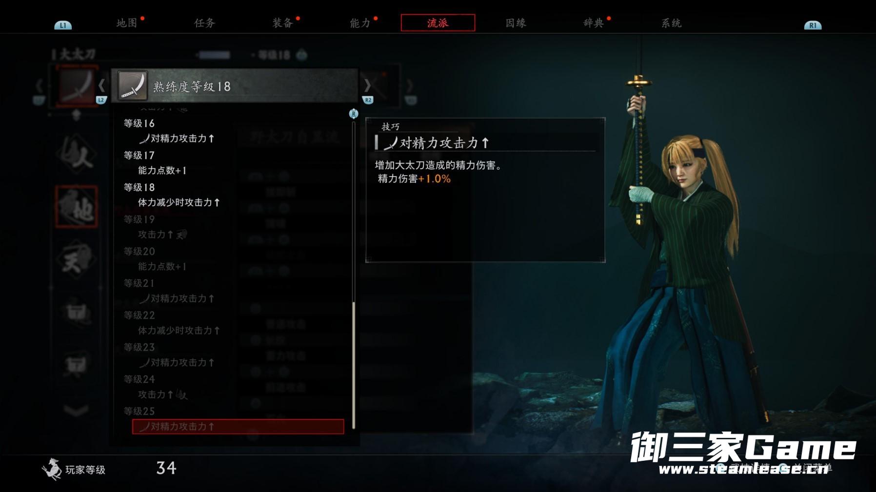 除此技能树的加点以外还有共通的作用,比如勇猛加点会增加你的物理攻击力和防御力、忍技会增加你的副武器攻击力和防御力——所以如同我们用同一把武器更适合提升战力上限一样,四项加点可能也更需要侧重于某一系(我是勇猛加满),不过想要尽可能多的加点,就需要你尽可能多的完成探索内容,尤其是NPC关系任务,否则特殊技能点的缺口是十分大的。
