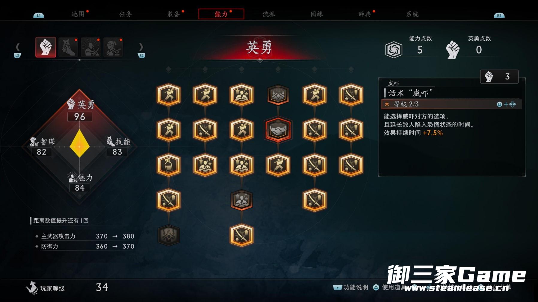 神社:简单粗暴通用技能点+1——本作分为通用技能点和勇猛、智谋、忍技、魅力四大特色技能点,后文会详细介绍