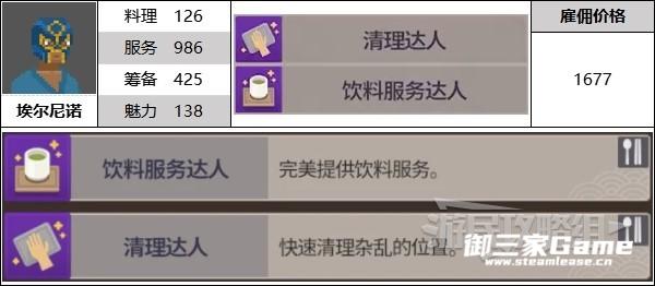 大堂推荐选择埃尔尼诺,其技能清理达人+饮料服务达人能够帮助戴夫节省大量时间。其次推荐一样有清理达人的比利。