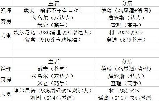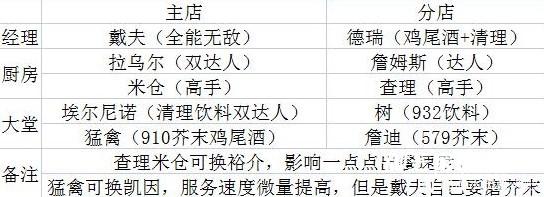 大堂要满足清理>鸡尾酒=饮料≥芥末,四个技能都要有。经理锁死德瑞的情况下,由于他的清理高优先度+855高服务,个人认为不用补清理人员。那么补一个饮料一个芥末。