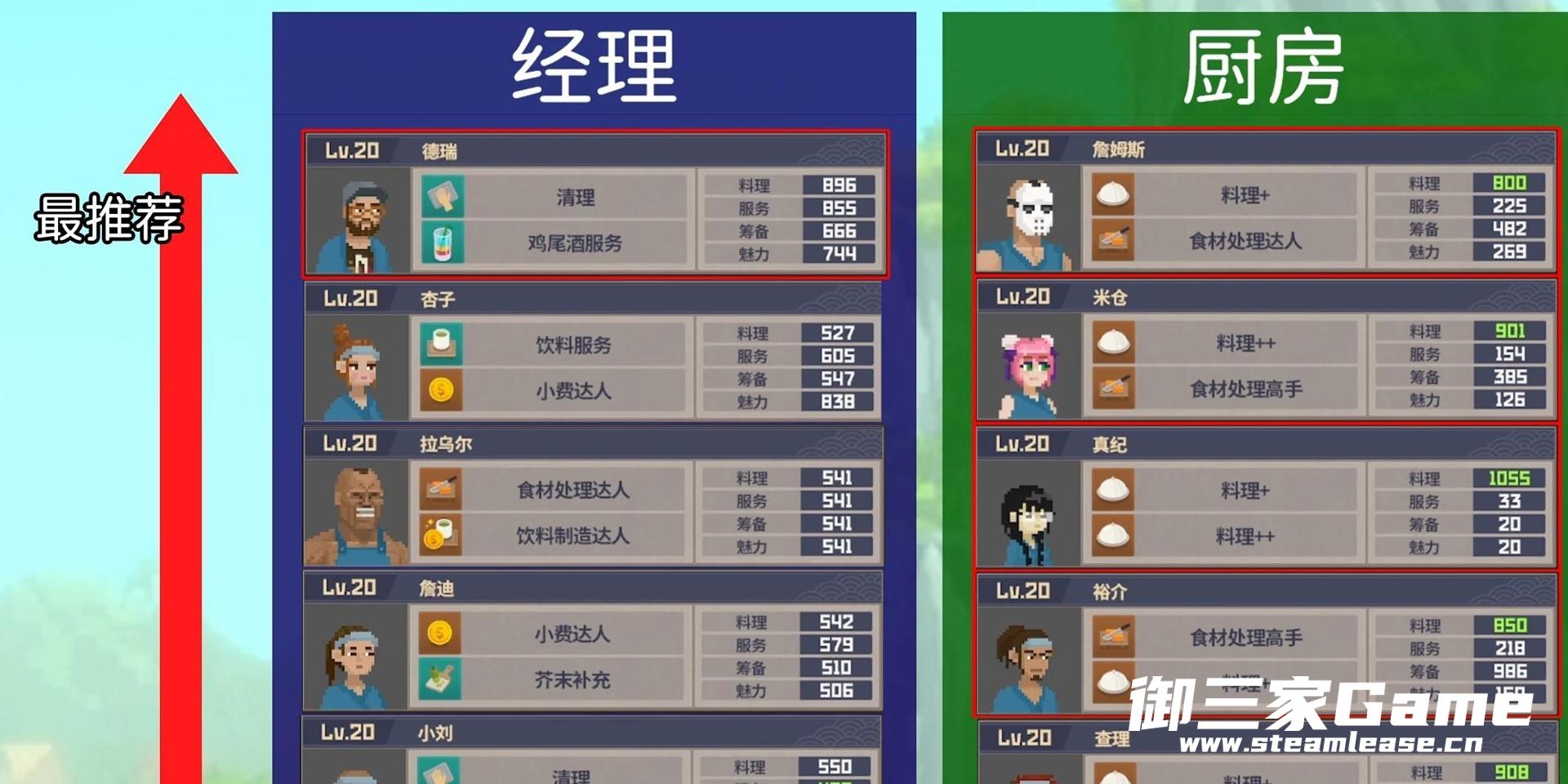 饮料制造达人(拉乌尔)所有饮料加十块钱,放哪儿都生效。个人认为这是全游戏唯一且独一档的特殊技能,虽然十块钱也只是锦上添花,但比料理属性溢出没用要好。所以拉乌尔才应该是厨师位独一档的首选员工。