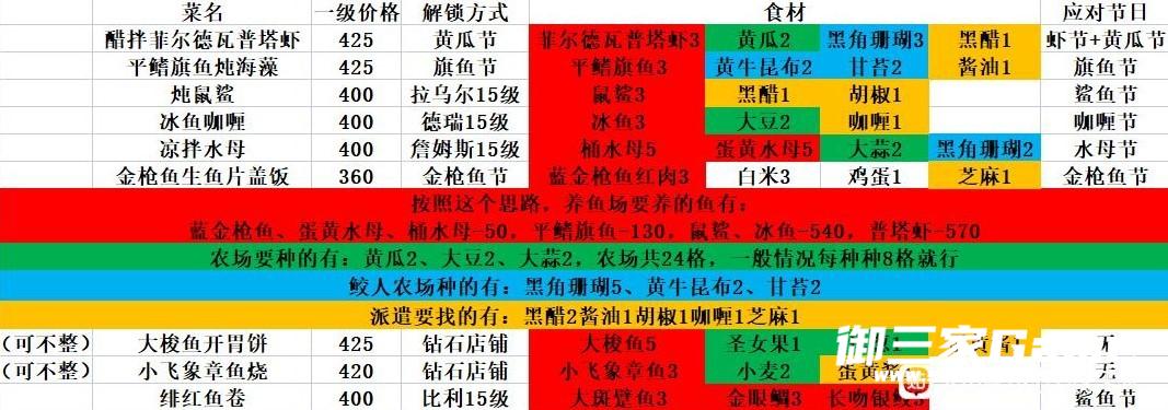 分店经理是最重要的,由上分析可知,经理需要料理≥500以解锁所有菜品,多了浪费。如果不做9级料理,只想卖8级那就可以相应降低。