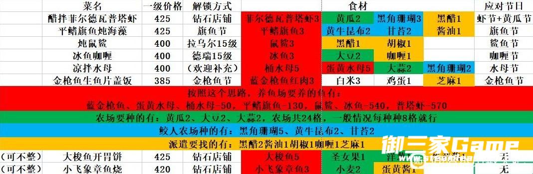 我的思路是:黄瓜串陨落后,料理应当应付日常+节日两种情况,所以我找出所有节日对应的最贵的料理(因为未考虑成本所以不一定是最赚钱的料理,欢迎讨论补充),而正好其中包括了425档位的日常最贵料理。所以我认为把应对七大美食节的六种料理全部升满,日常也可以卖其中有富余的,这样就可以应对所有情况。详情如图。