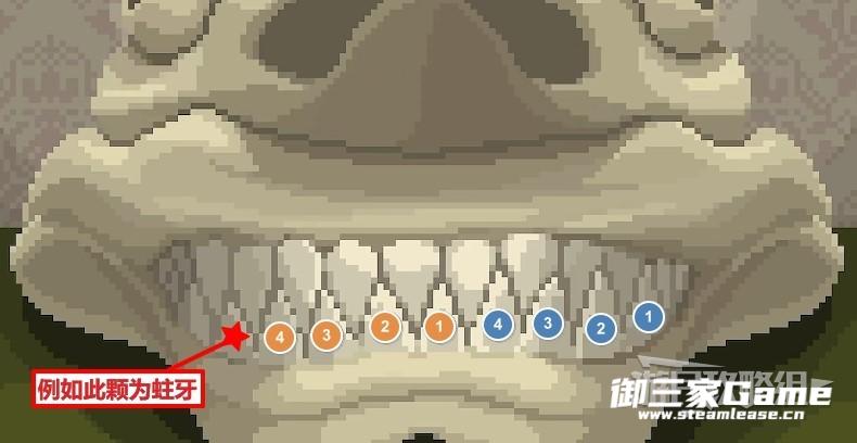 II.>如果此时剩余的牙齿数量不是4的倍数,则算出与它最近的4的倍数差几颗牙,然后选择按所示数量的牙,使剩余牙齿数量变为4的倍数。例如:如果与蛀牙之间剩余13颗牙,那么就选择按1颗,将剩余的牙齿数量变为12;如果与蛀牙之间有19颗牙需要按,那么就选择按3颗,将剩余的牙齿数量变为16,以此类推。