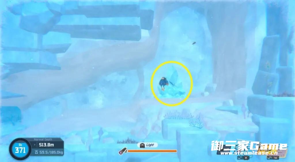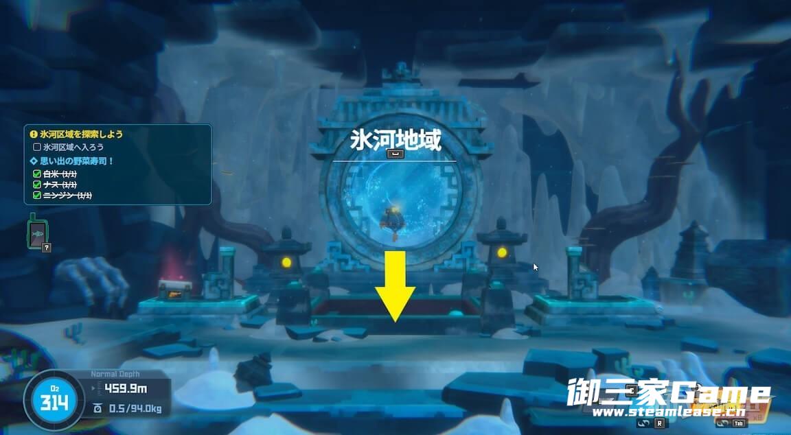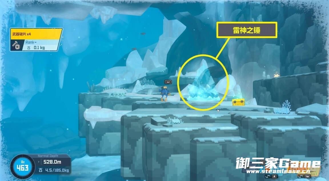 在冰河区域找到雷神之锤。雷神之锤会在冰河区域随机的冰块内出现,可以用近战攻击打碎冰块来获得。笔者是在水深530m右侧找到的,其他位置也有概率刷新(例如左侧冰洞)。如果一圈没找到的话可以先回船上再下去找。冰块也可以使用强化后的匕首击碎。