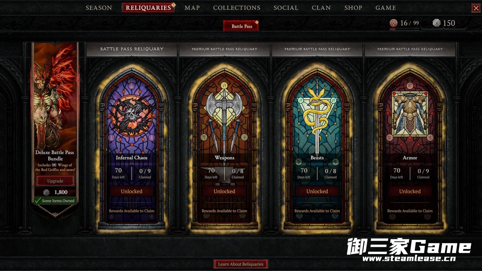 解锁所有特级战斗通行证圣物箱的使用权,同时省下 500 枚白金币¹。只要拥有特级战斗通行证,完成圣物箱就能赢得部分「赤红狮鹫」防具套装。