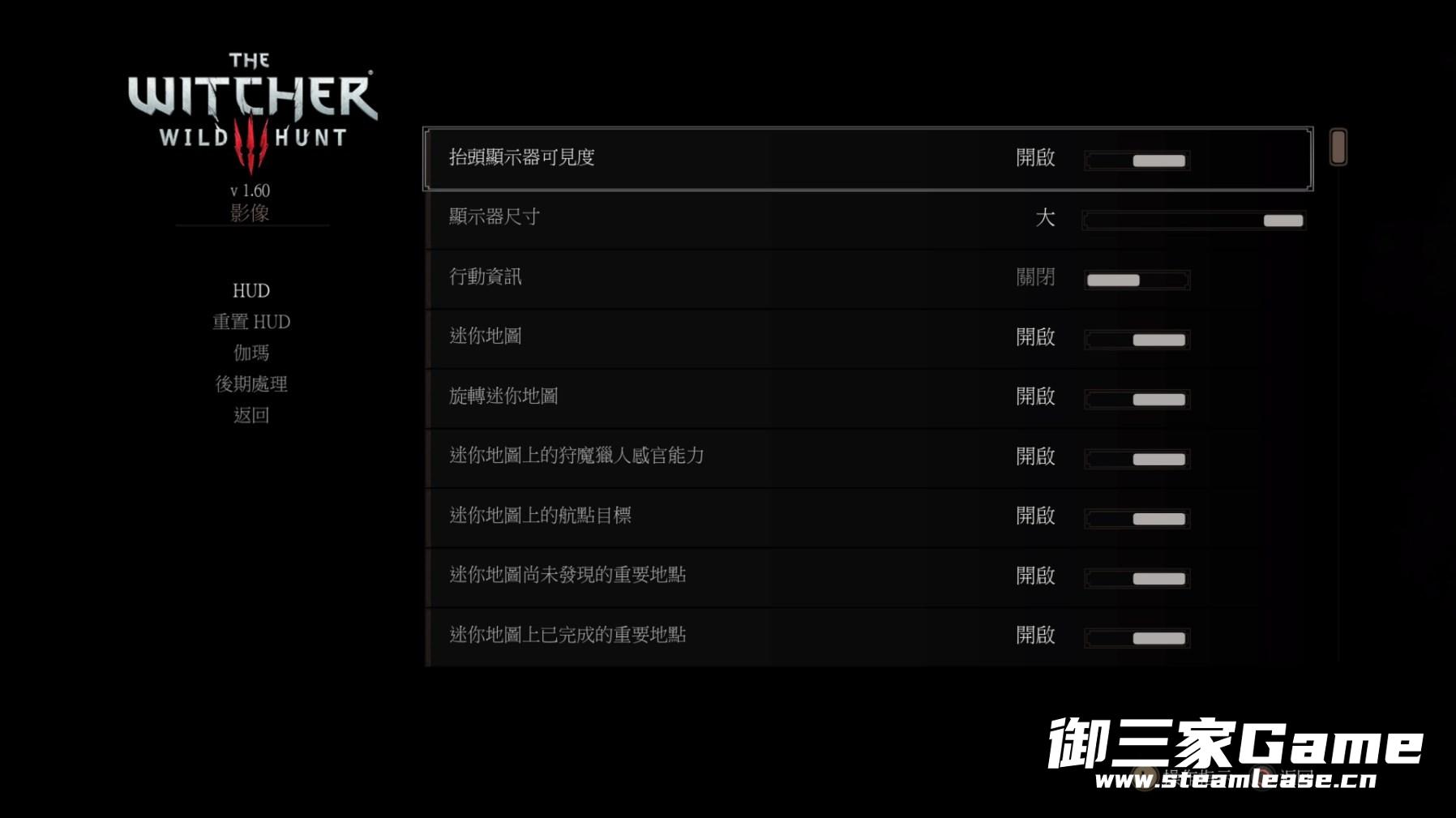 主菜单→选项→影像→HUD:设置游戏进行时的UI界面,其中迷你地图上的猎魔人感官能力默认关闭,该设置能在开启猎魔人感官时,将任务关健线索显示在小地图上。