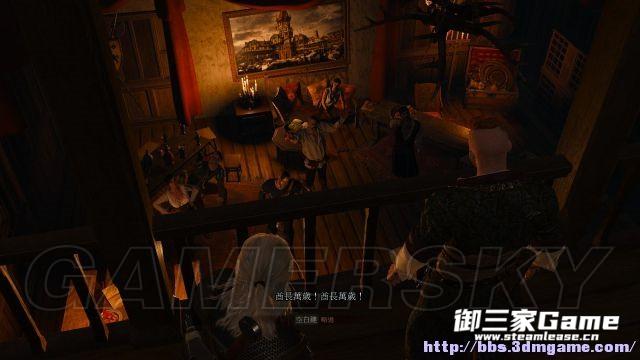 然后跟随欧吉尔德落到大厅,才得知这帮人也不是什么好家伙(众人疯狂地崇拜欧吉尔德),他们占据了这个庄园,而且将庄园主的女儿当成仆人来差遣,但杰洛特并不理会此事,他是因委托而来的。