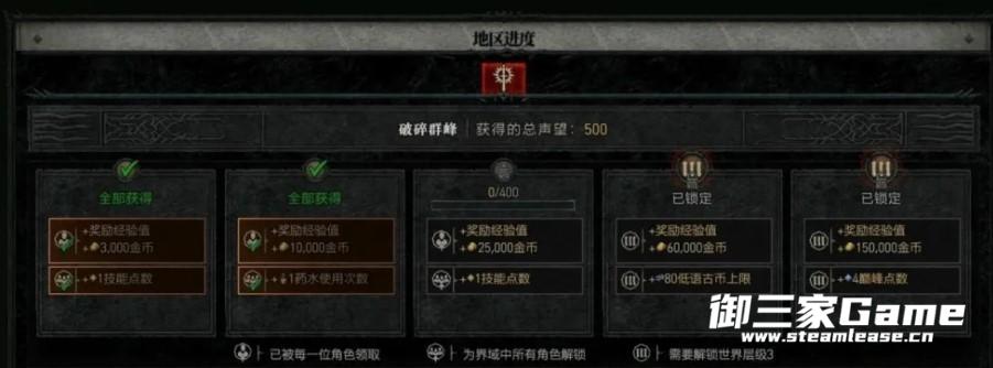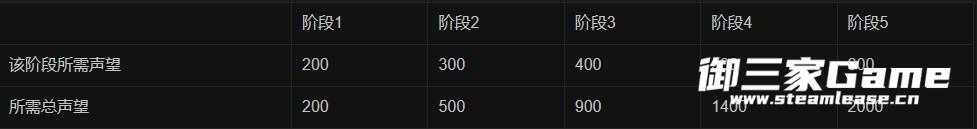 每个阶段都需要一定数量的声望值才能解锁。每个角色在各地的声望中都从 0 点开始。
