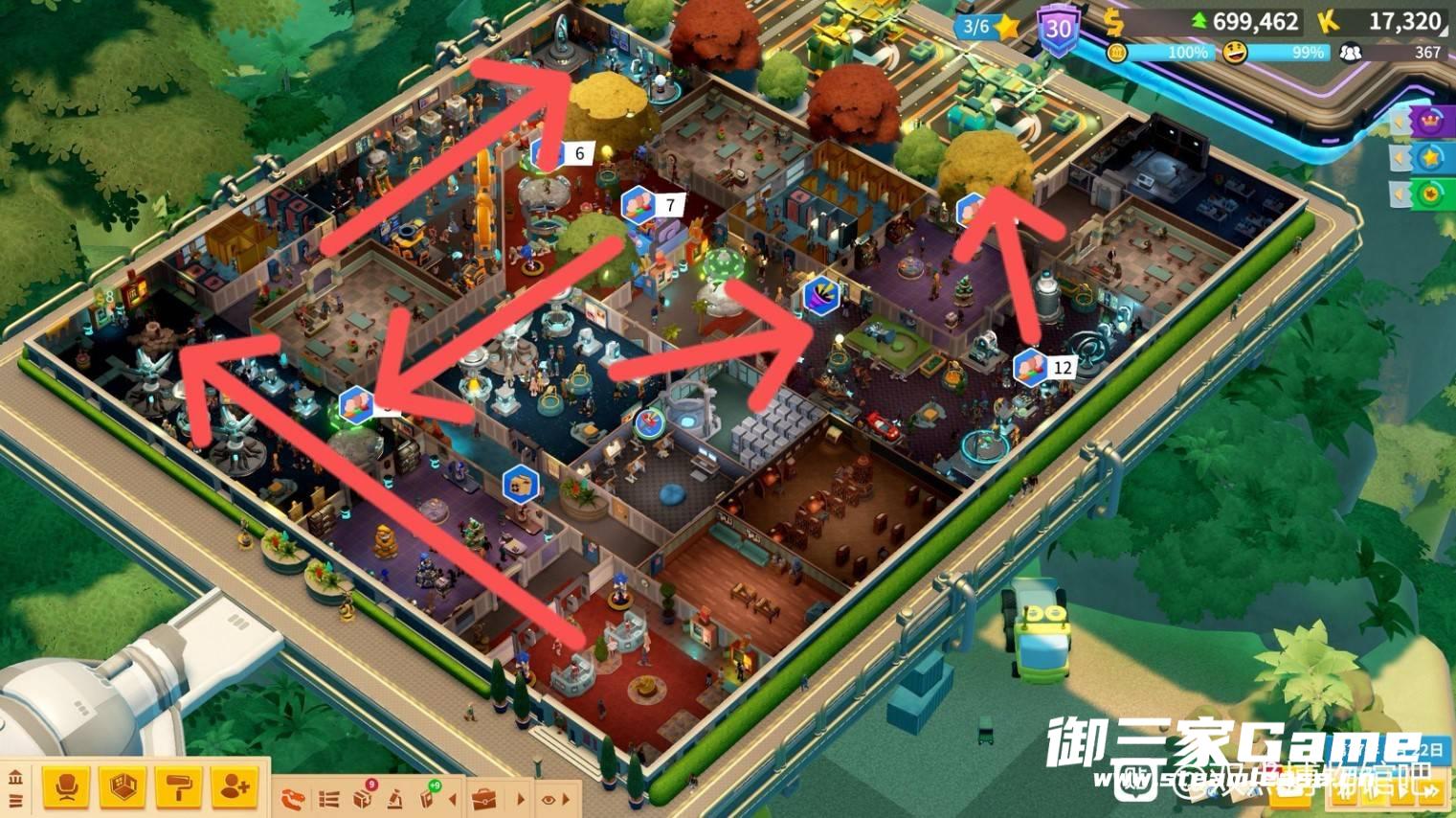 每个展厅都要有娱乐、休息、贩卖机、导览站、地图牌,提高游客幸福度、停留意愿和收益。