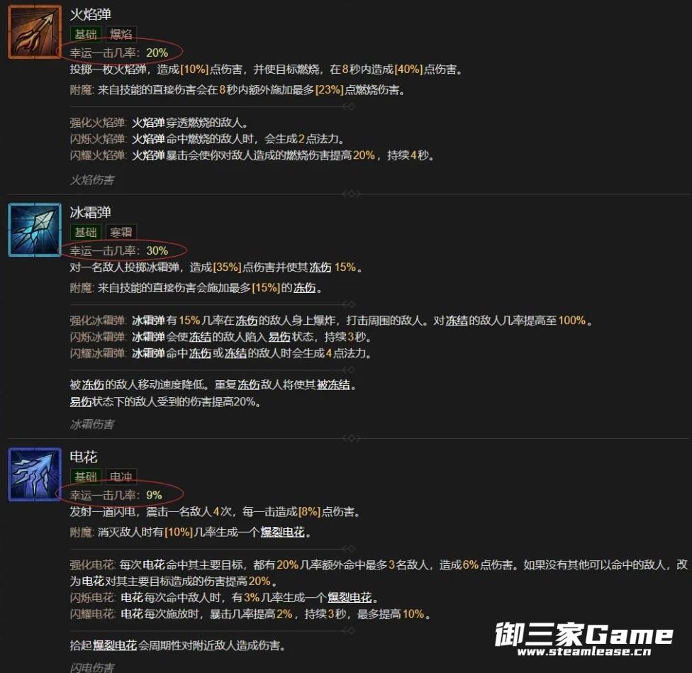 3、装备上提供的幸运一击斩杀受伤非精英敌人的词缀,效果是:X%的几率斩杀35%血以下的普通怪,X%=技能得幸运一击触发几率*(1+装备词缀提供的幸运一击触发几率)。