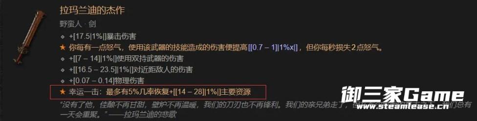 每个技能都有它自己的幸运一击几率,它本身没有任何作用。但是装备和其他技能可以提供幸运一击触发时的效果。例如上图,某个技能有 50% 的幸运一击几率,身上装备这样一个词缀:“幸运一击:最多有10%几率恢复20%主要资源”,那么该技能命中敌人后,你有 5% 的几率恢复20%主要资源。