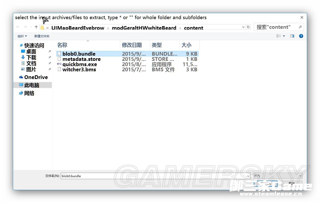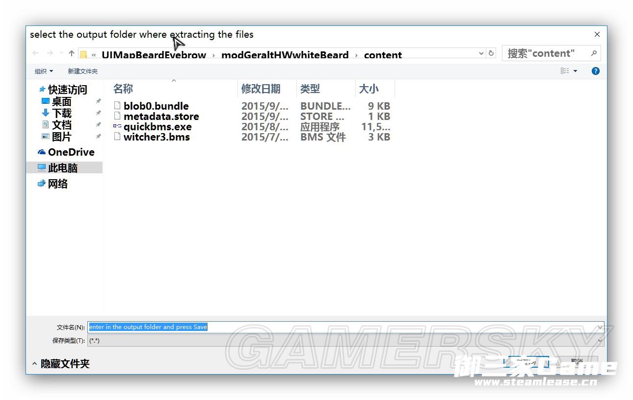 I.复制quickbms.exe及witcher3.bms到MOD文件夹\content下(可选)。打开quickbms.exe,第一次弹窗选取同一文件夹下的Witcher3.bms,第二次弹窗选取需要解包的blob0.bundle或buffers0.bundle,最后一次弹窗点击保存。之后将解包所得的文件夹放到第二步建立的cooked文件夹下。使用QuickBMS解包时,明显缺少文件则改用II,反之同理。QuickBMS也可以解包不适用于带texture.cache的MOD。