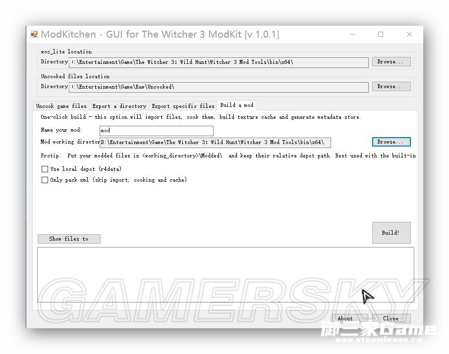 将所有解包得到的文件夹放入第二步中新建的Cooked文件夹(或者是Modded文件夹,建议使用前者)下,如有提示覆盖则自行选取保留哪个MOD的文件。在ModKitchen中选择Build a mod,然后在Name your mod处自行命名一个以mod开头的名称,如modCollection。然后在Mod working directory处选择第二步中新建的Raw文件夹。然后点击Build!,如图。