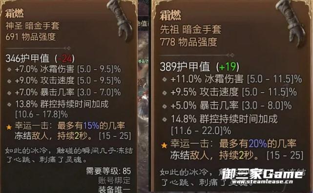 品质越高,装备的基础属性和词缀的上下限就越高,普通的手套技能等级最多+2,神圣级别最多+3,先祖就能+4。暗金装备词缀固定,但品质会影响词缀的区间。