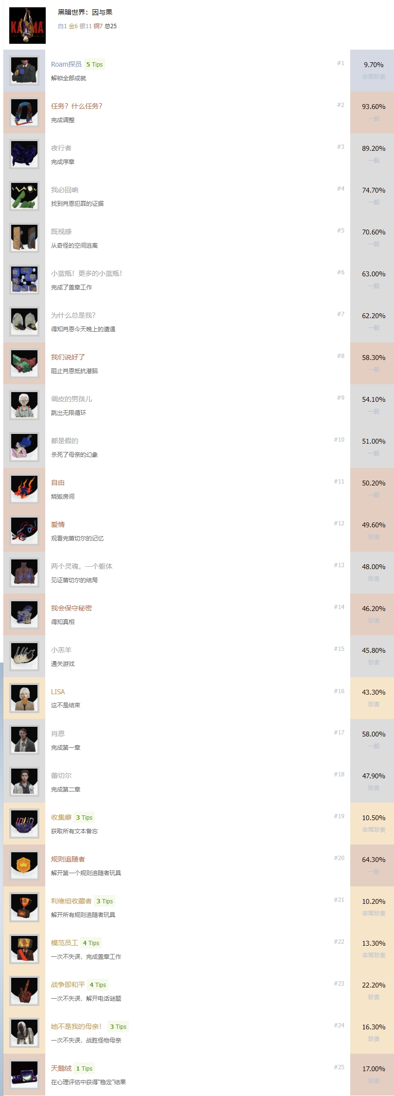 《黑暗世界因与果》共有25个奖杯,其中包含7个铜杯,11个银杯,6个金杯和1个白金奖杯,下面为大家带来《黑暗世界因与果》中文奖杯列表一览,含奖杯解锁条件说明,希望能够帮助到大家。