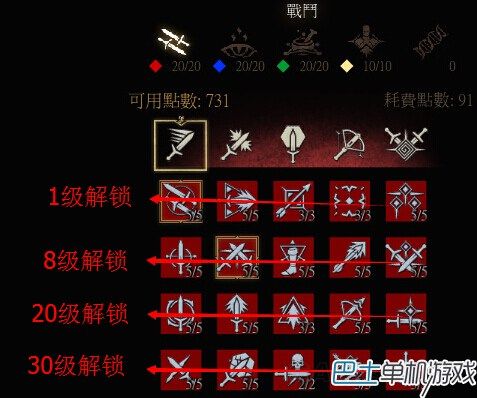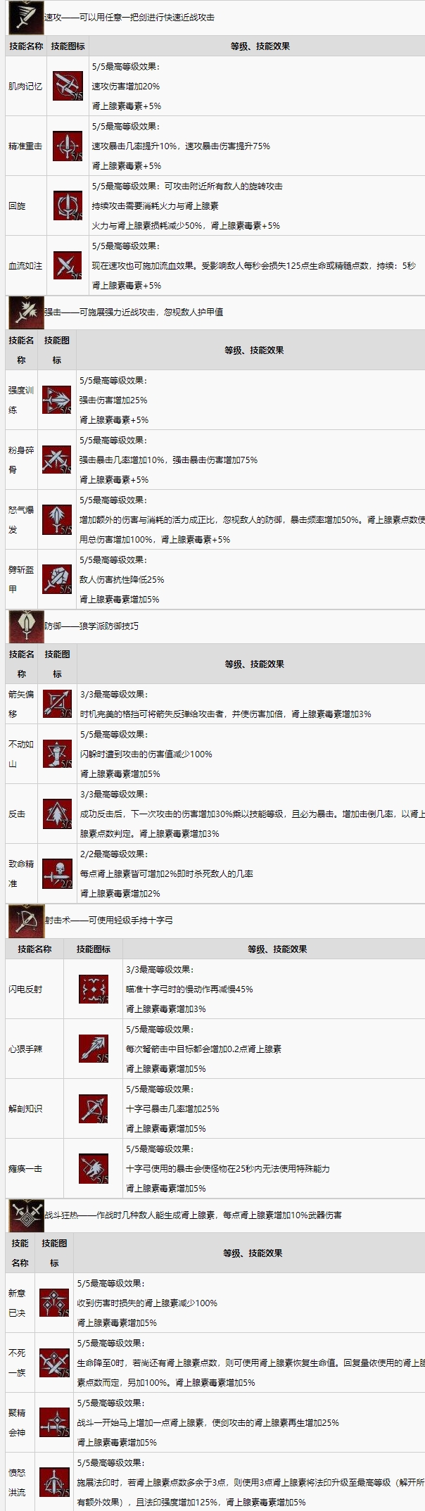 战斗及技能在战斗技能中一共会有5大技能,4个树状形式的分支技能,解锁分别需要游戏角色到达8、20、30级,且分支技能同时可以升到2~5级不等(每个级别效果不同),下面则是每个分支技能的属性效果一览。