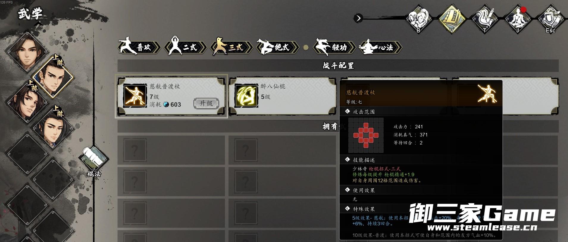 4、卫霍入队早,但前期比较无力,不过很早即可触发队友专属任务,完成队友专属任务后,很早就可以拿到金色技能【慈航普渡杖】,同时还会学会【吐纳法】,然后就能肉起来了。