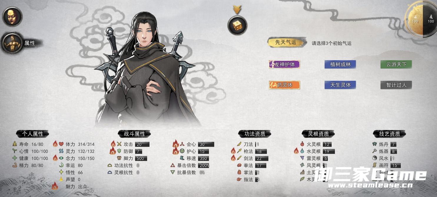 悟性:建议100左右甚至往上,基础悟性可以靠刷,我是刷到80左右带的其他天赋凑到100多,这项数值影响修炼速度,后期很重要,前期效果不明显。这关系到我的玩法,所以我宁可带书香门第。