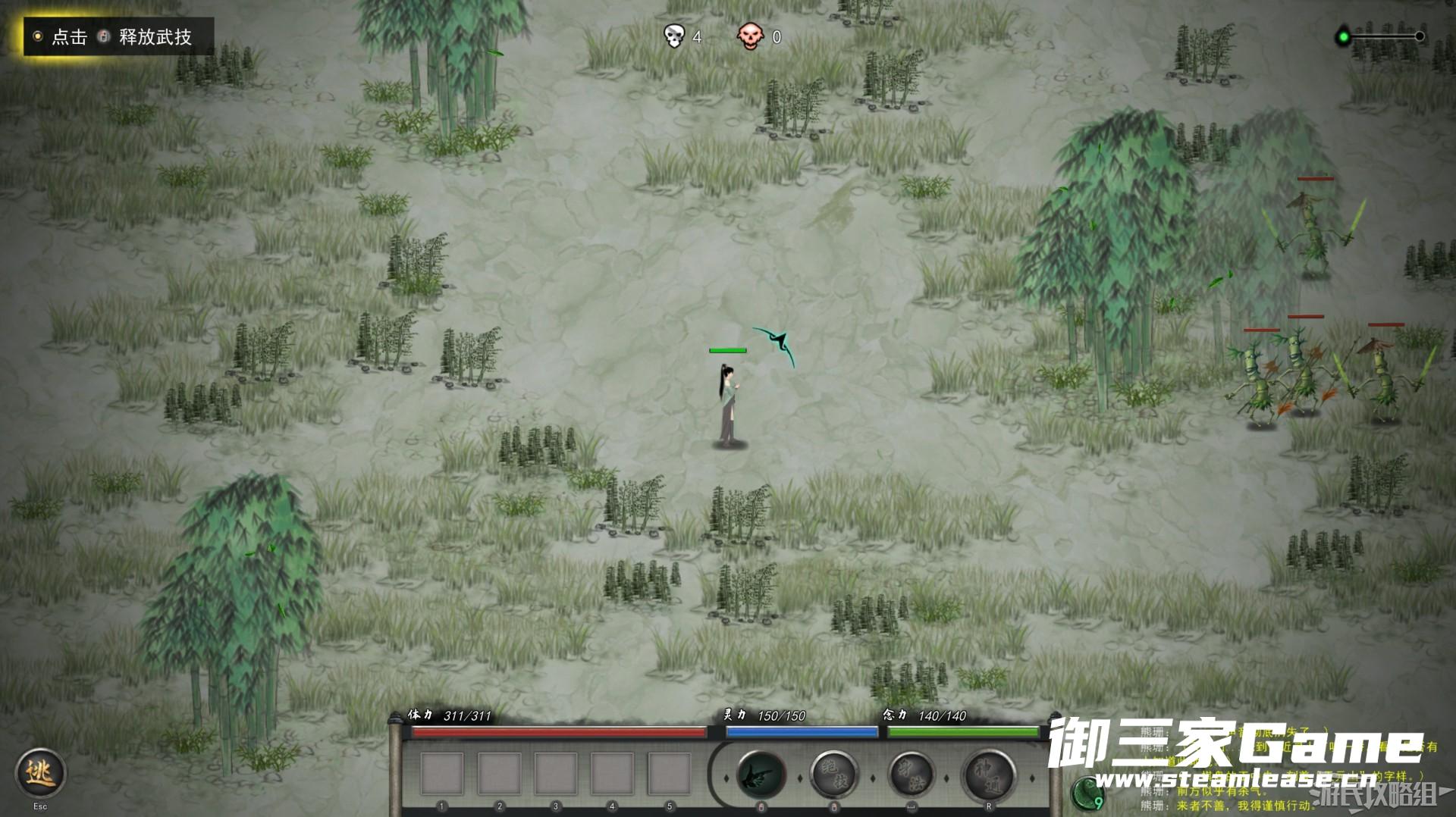 神器选择完毕后老者让我们到天元山寻找他,同时进入战斗关卡,按住左键释放武技将妖怪消灭即可。