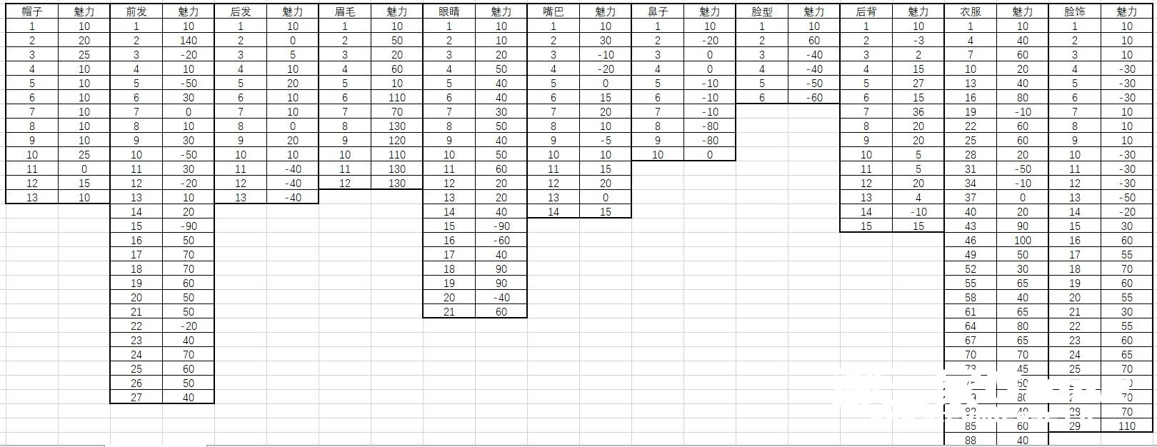 假定每个部位的一号部件魅力都为10,然后对应魅力值的增增减减算出来的