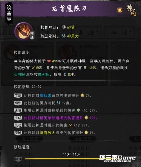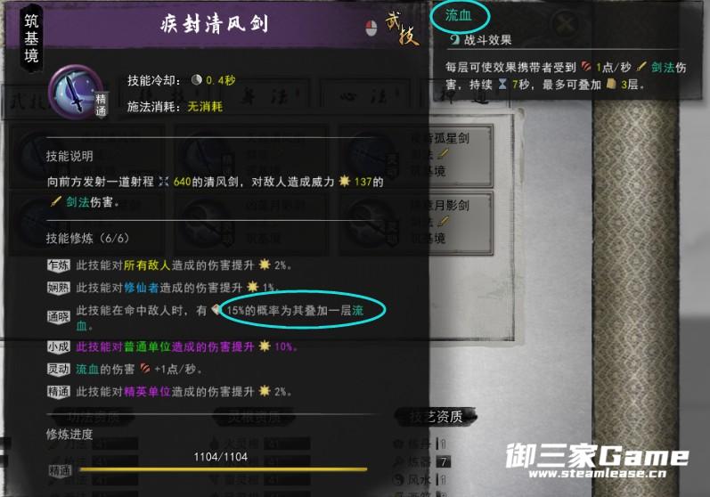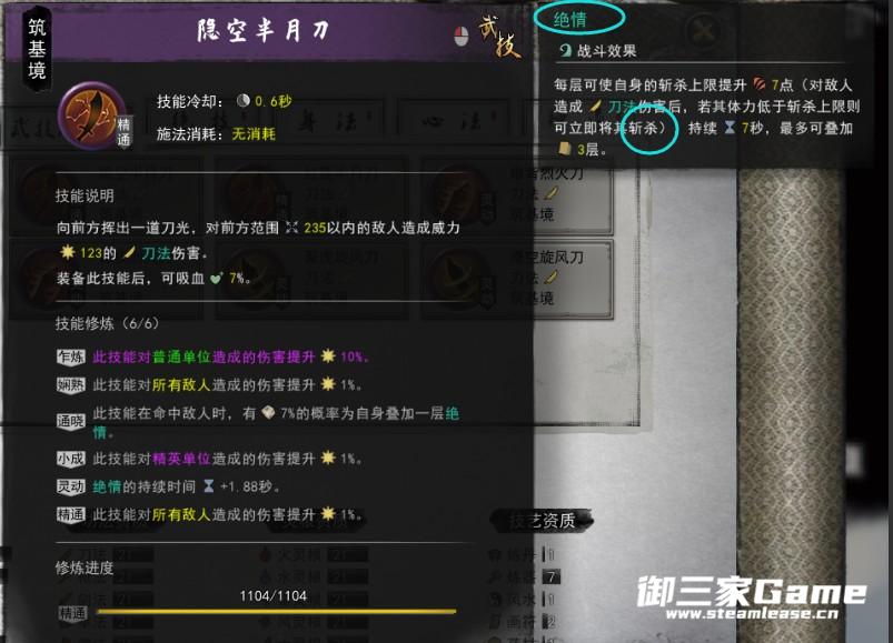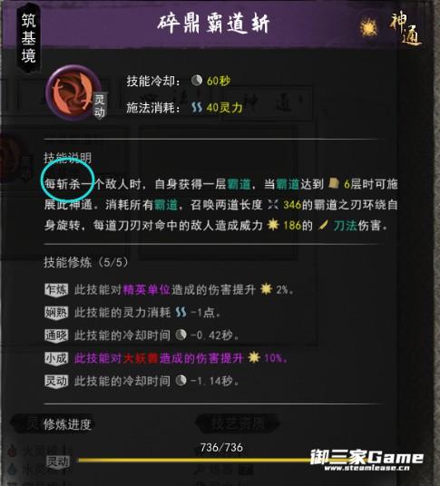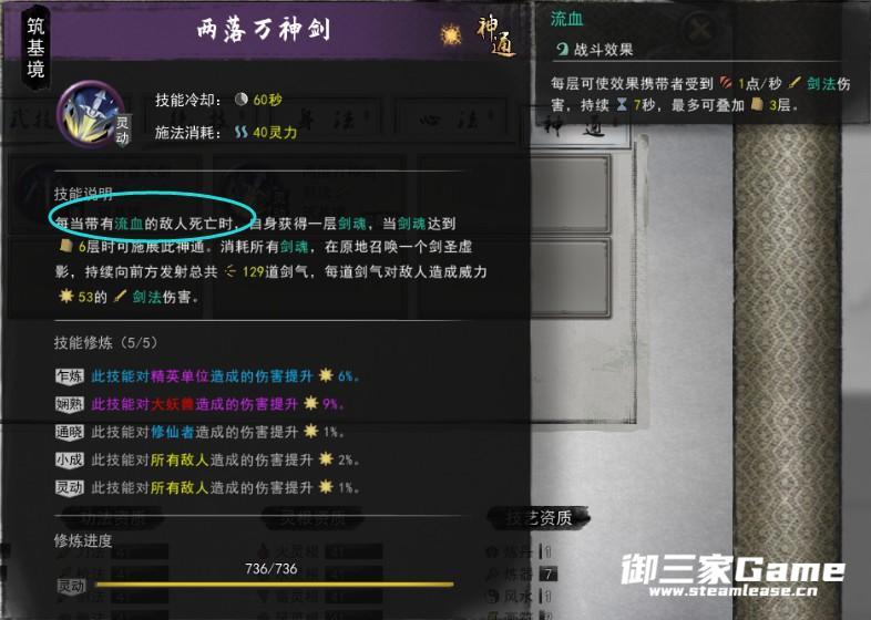 第二套左键攻击敌人触发敌人流血效果,敌人在持有流血效果死亡时,玩家获得一层剑魂,杀死6名敌人时,可使用神通