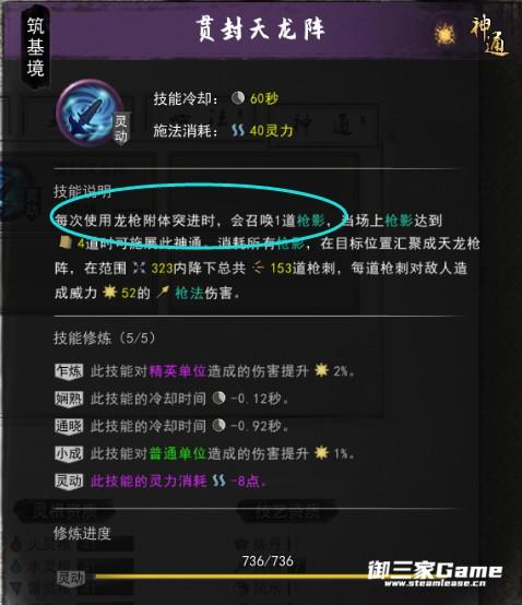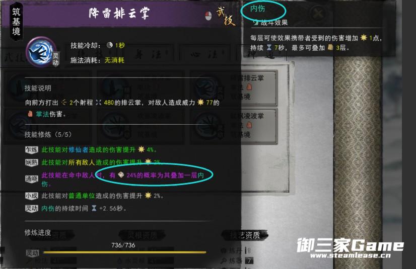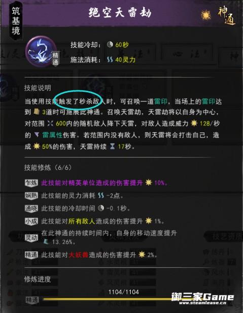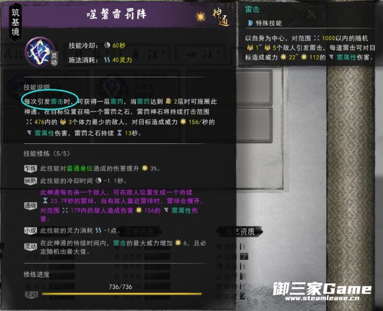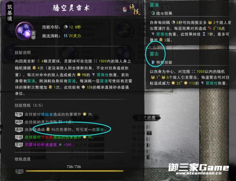 第二套这个目前比较苛刻,要对敌人造成96次伤害(不同的敌人也行)才会触发一次雷击,触发两次时可以开神通(有心法可以减少触发雷击的攻击次数,参悟也行