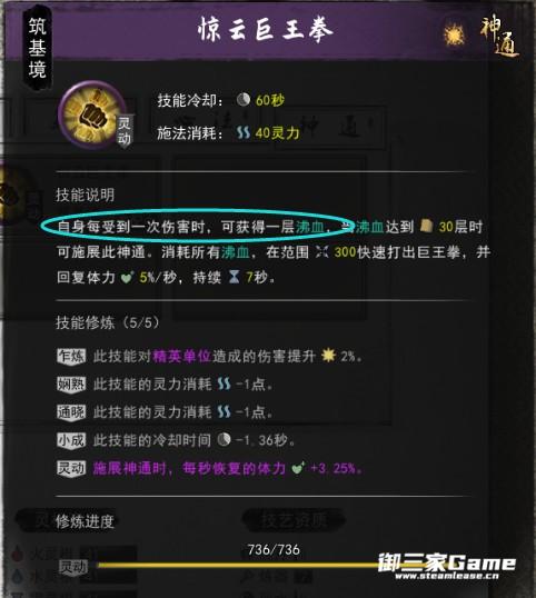 第一套自己每受到1次伤害获得一层沸血,被打30次就可以使用神通