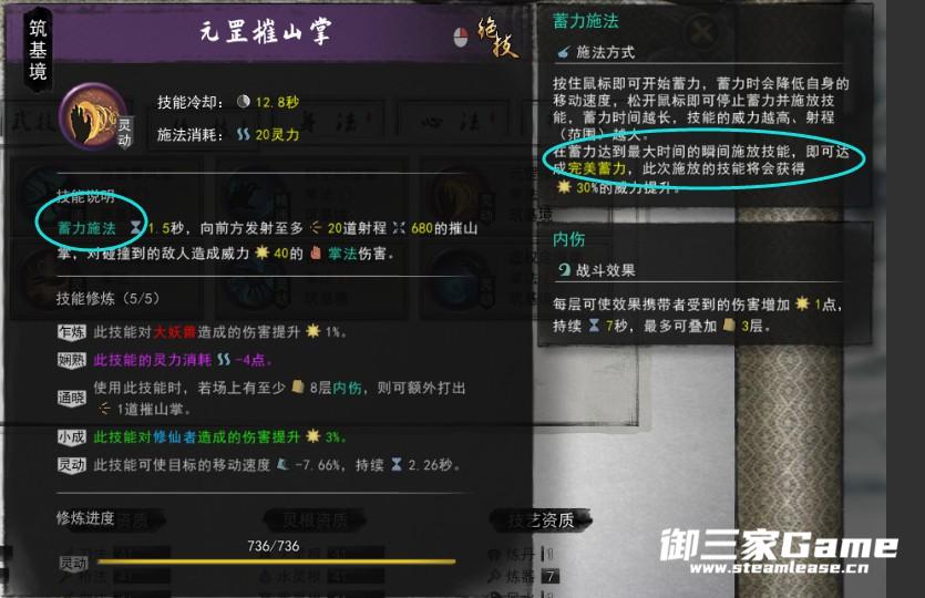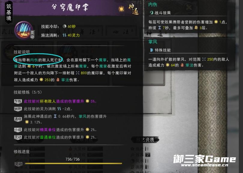 第二套左键攻击时有几率对敌人触发内伤,当敌人带有内伤死掉时,会在原地生成一个魔掌,达到6次,就能释放神通