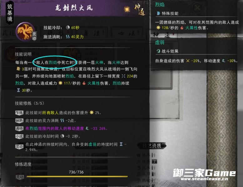 第一套右键持续施法(长按技能)会有几率对敌人挂上烈焰buff,敌人再烈焰buff效果死亡,玩家获得一层火神,3层后可释放神通