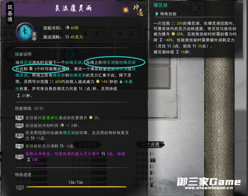 第一套右键蓄力(长按)最大时,会生成一个爆灵湖,爆灵湖消失后会变成枯竭灵湖,有三个湖的时候就可以触发神通(我也是很懵的这解释,我通俗来讲就是用了3次右键就可以用这个神通了