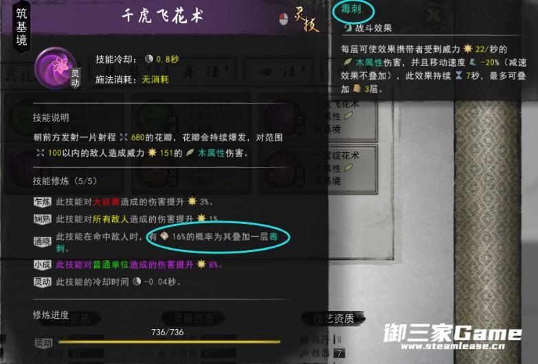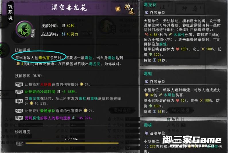 第一套左键有几率对敌人触发毒刺效果(毒伤害),当敌人在有毒伤害死亡时(技能说明是说被毒伤害杀死才算,其实就是挂上毒buff杀死也算)获得一层毒蚀,毒蚀达到4层可释放神通