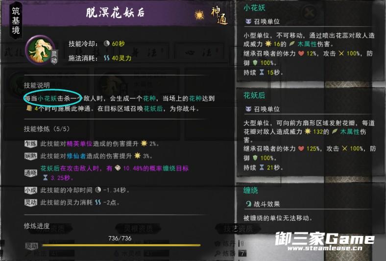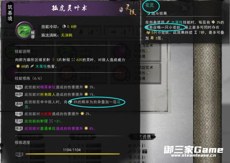 第二套左键攻击时有几率为自身叠一层花灵,每层花灵有3%的几率召唤小花妖,右键也能招小花妖,当小花妖击杀一个敌人时,会生成一个花种,4个花种时可释放神通